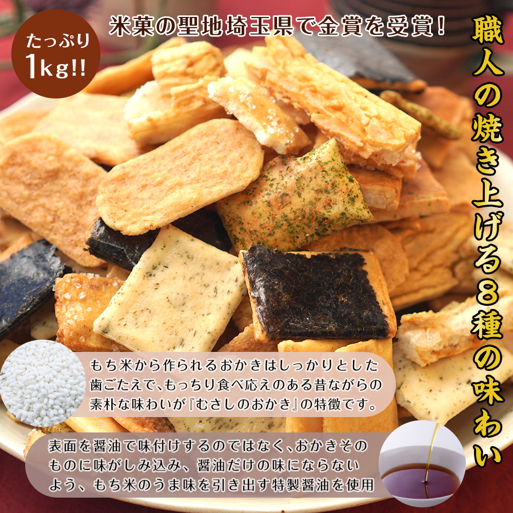 米菓の聖地埼玉県で金賞を受賞! もち米から作られるおかきはしっかりとした歯ごたえで、もっちり食べ応えのある昔ながらの素朴な味わいが『むさしのおかき』の特徴です。 表面を醤油で味付けするのではなく、おかきそのものに味がしみ込み、醤油だけの味にならないよう、もち米のうま味を引き出す特製醤油を使用。