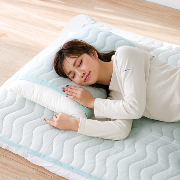●<表地>毛羽部:レーヨン100%(竹繊維使用)、グランド部:ポリエステル100%、<裏地>ポリエステル80%・綿20%、<詰め物>ポリエステルわた100% ●<敷きパッド>中国製、<枕パッド>日本製