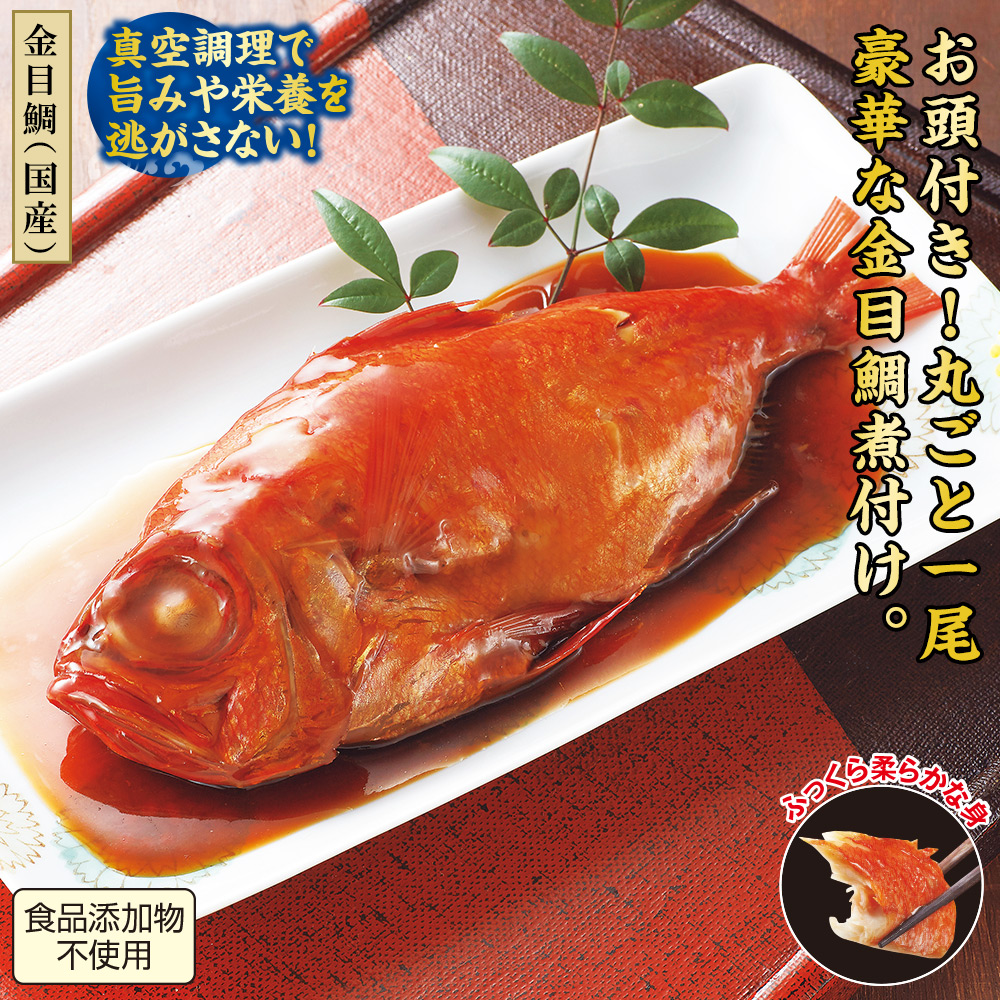【金目鯛(国産)】 真空調理で旨みや栄養を逃がさない! 水揚げされた金目鯛を鱗・内臓を取り除いて煮付けに。 甘辛醤油ダレでじっくり煮込んだ手作りの味と食感です。 ふっくら柔らかな身。 食品添加物不使用。