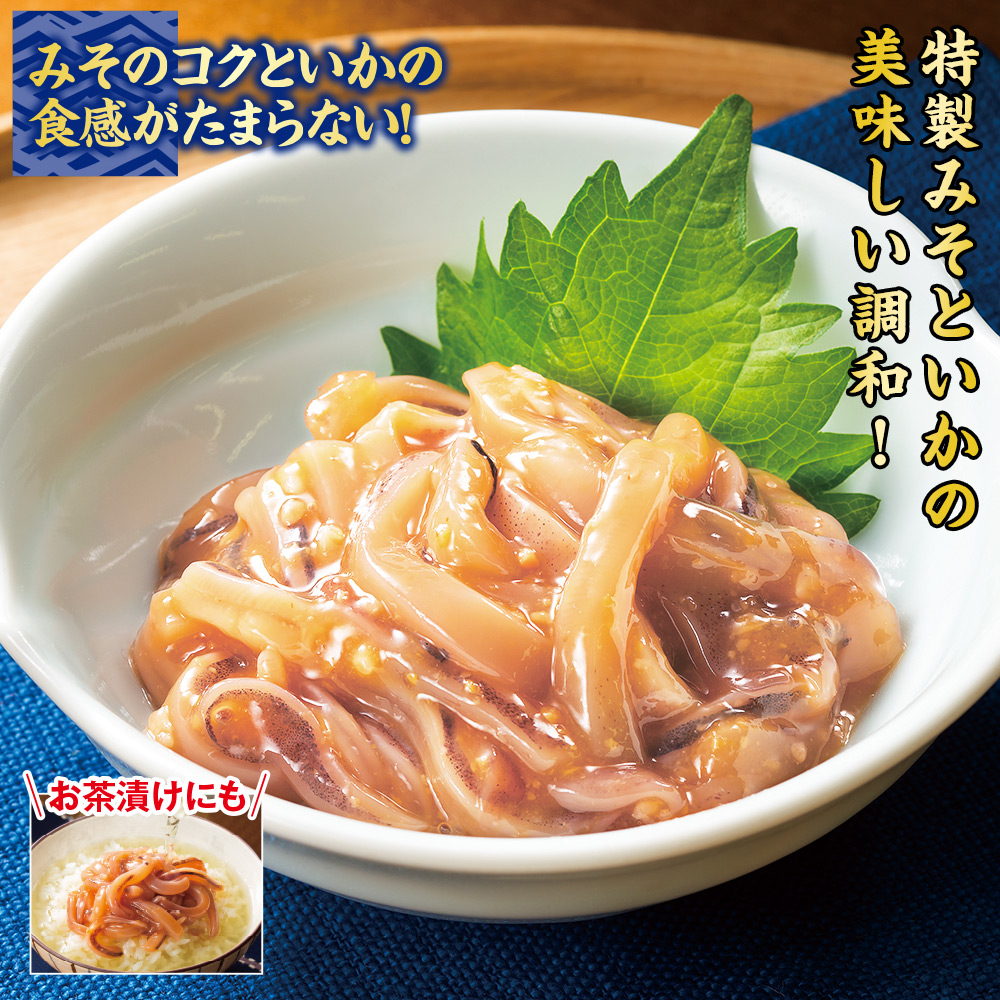 ペルー産アメリカオオアカイカに特製のみそをあえじっくりと熟成。 飽きることない深みのある味付けに仕上げました。味噌といかの食感がマッチした逸品です。