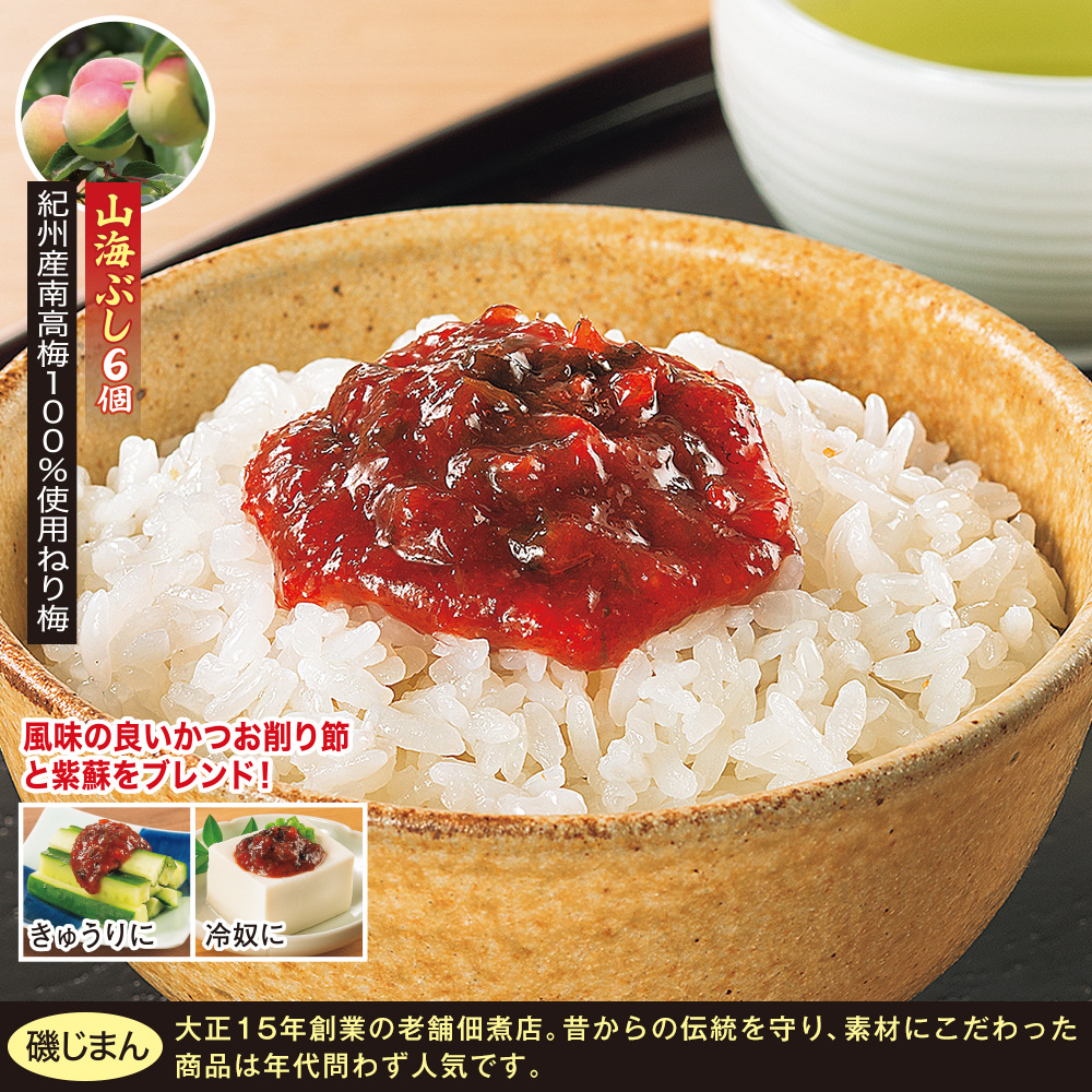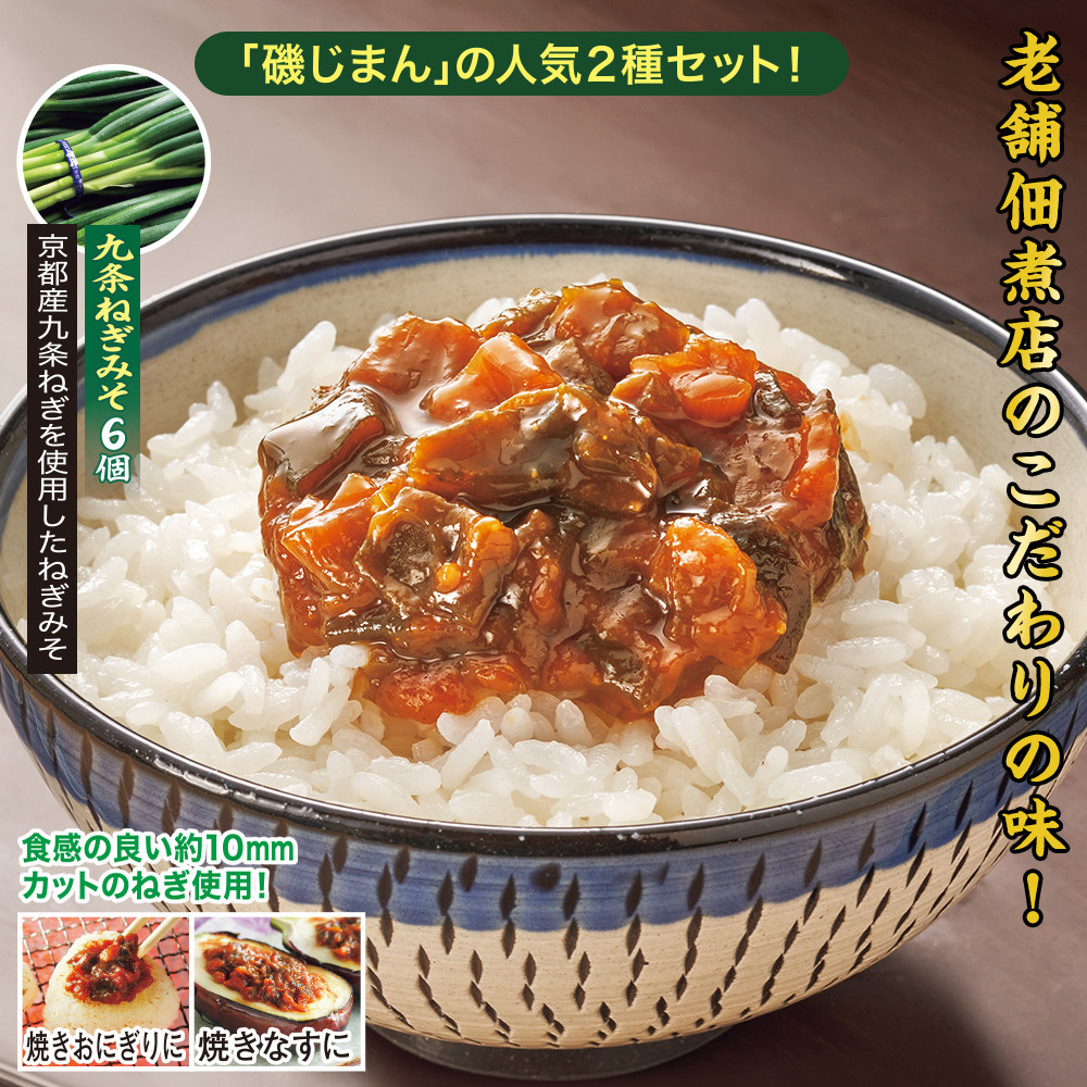 「磯じまん」の人気2種セット! 磯じまん 大正15年創業の老舗佃煮店。昔からの伝統を守り、素材にこだわった商品は年代問わず人気です。 甘口で食べやすく仕上げた「九条ねぎみそ」と、ねり梅の酸味が爽やかな「山海ぶし」の2種セットです。 ・九条ねぎみそ 京都産九条ねぎを使用したねぎみそ 食感の良い約10mmカットのねぎ使用! ・山海ぶし 紀州産南高梅100%使用ねり梅 風味の良いかつお削り節と紫蘇をブレンド!