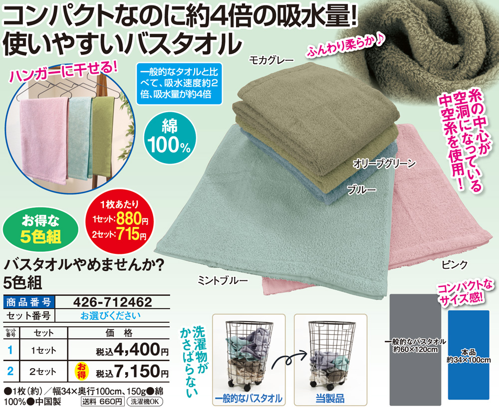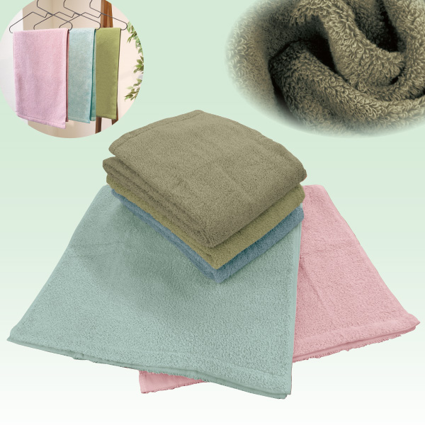 一般的なタオルと比べて、吸水速度約2倍、吸水量が約4倍。 糸の中心が空洞になっている中空糸を使用! コンパクトなサイズ感! ハンガーに干せる! ◎お得な5色組 ◎綿100% ◎洗濯物がかさばらない