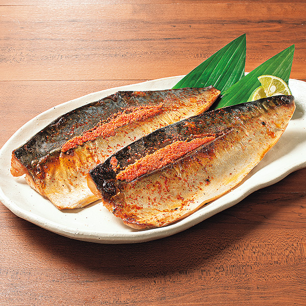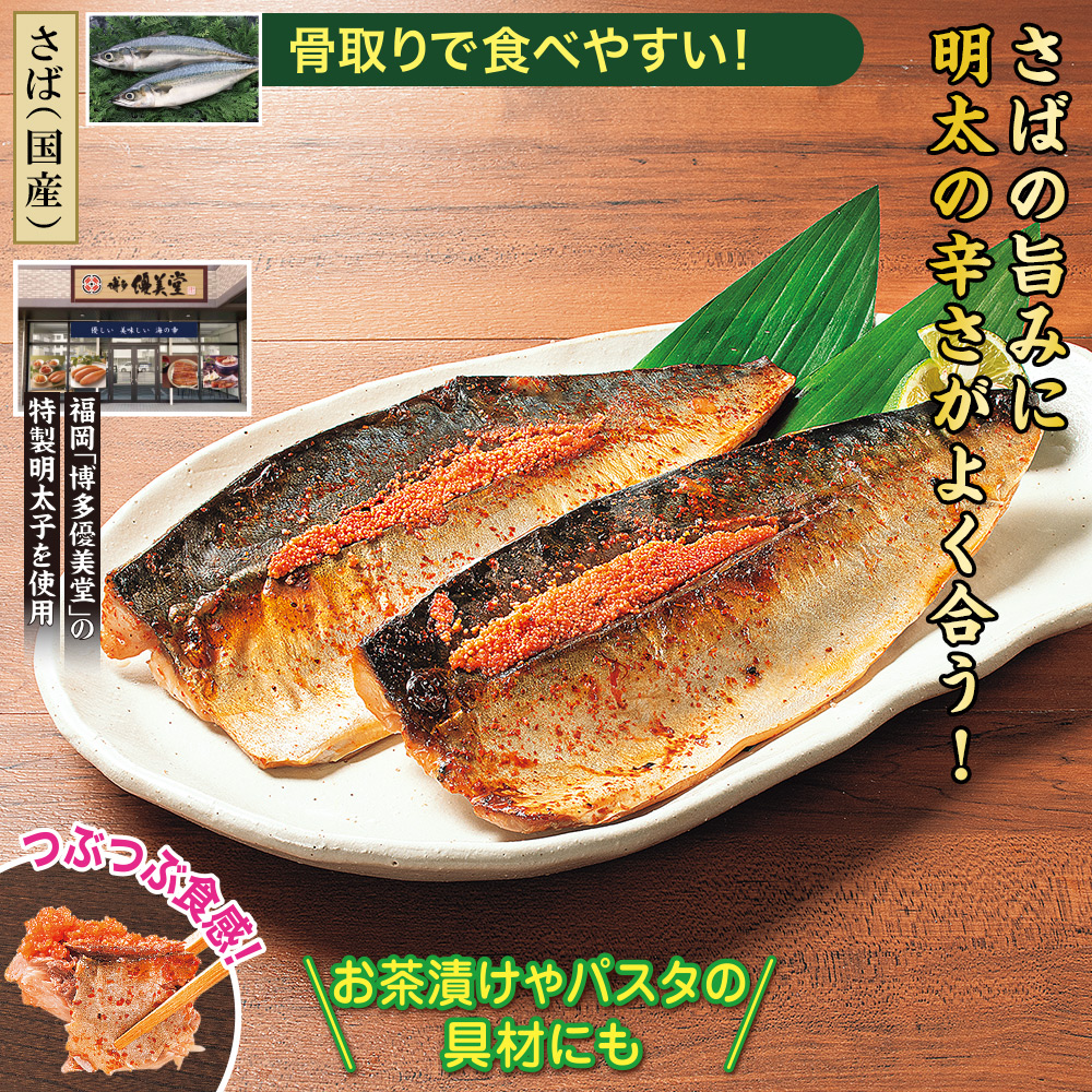 【さば(国産)】 骨取りで食べやすい! 国産の脂ののったさばを明太タレに24時間漬け込み、さらに明太子をたっぷり詰め込みました。 福岡「博多優美堂」の特製明太子を使用。 お茶漬けやパスタの具材にも。 つぶつぶ食感!