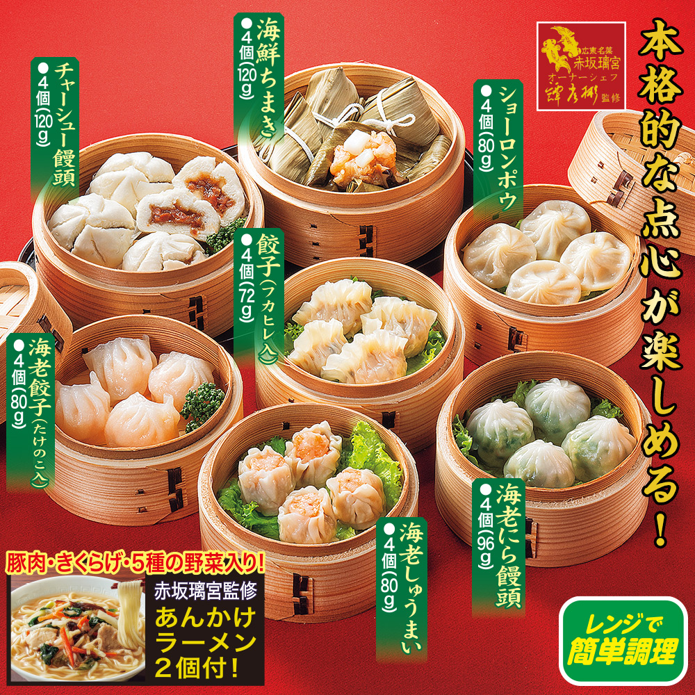 赤坂璃宮監修の豪華点心7種セット! 中華の名店「赤坂璃宮」オーナーシェフが監修した点心セットに、あんかけラーメンが付いた豪華セットです。 ・海鮮ちまき・ショーロンポウ・海老にら饅頭・餃子(フカヒレ入)・海老しゅうまい・チャーシュー饅頭・海老餃子(たけのこ入) 赤坂璃宮監修 あんかけラーメン2個付! 豚肉・きくらげ・5種の野菜入り! レンジで簡単調理。