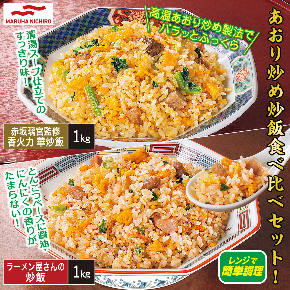 中華の名店「赤坂璃宮」と、町中華の「ラーメン屋さん」の炒飯食べ比べセットです。 ・赤坂璃宮監修香火力華炒飯 清湯スープ仕立てのすっきり味! 高温あおり炒め製法でパラッとふっくら。 ・ラーメン屋さんの炒飯 とんこつベースに醤油・にんにくの香りがたまらない! 大容量でお届けします。 レンジで簡単調理。