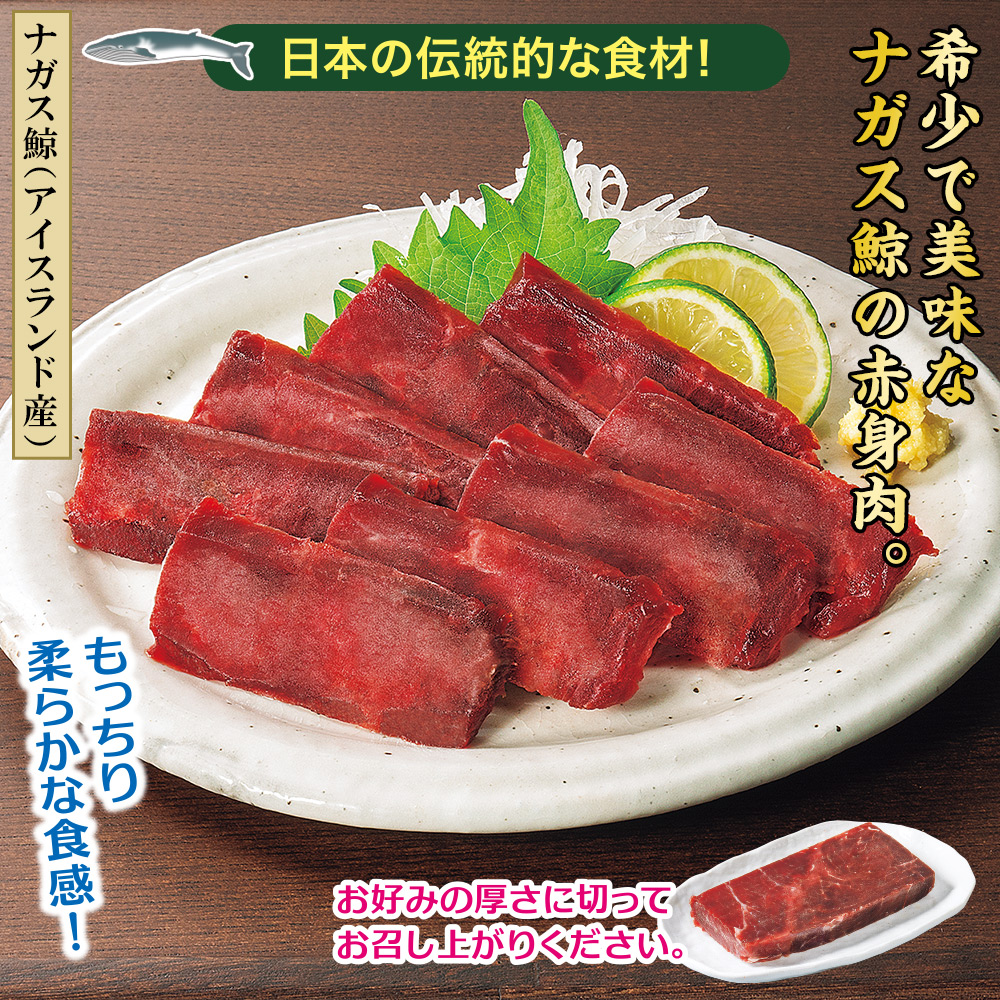 【ナガス鯨(アイスランド産)】 日本の伝統的な食材! 希少でクセがなく、上品な味わいのナガス鯨の赤身肉です。鯨ならではの味と香りを楽しめます。 お好みの厚さに切ってお召し上がりください。 もっちり柔らかな食感!