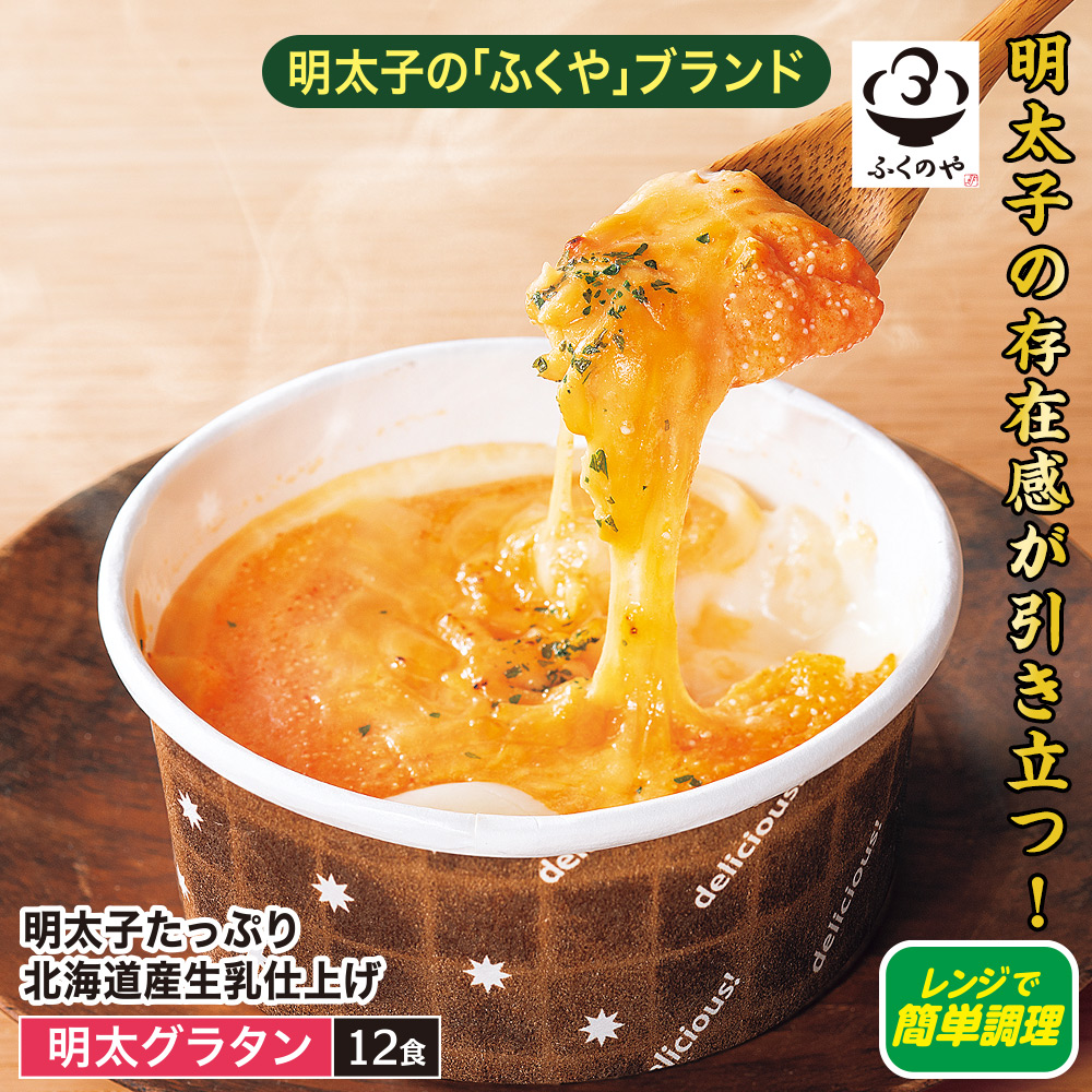 明太子の「ふくや」ブランド。 明太子、チーズをたっぷり使ったクリーミーなグラタンです。 北海道産生乳仕上げ。 レンジで簡単調理。