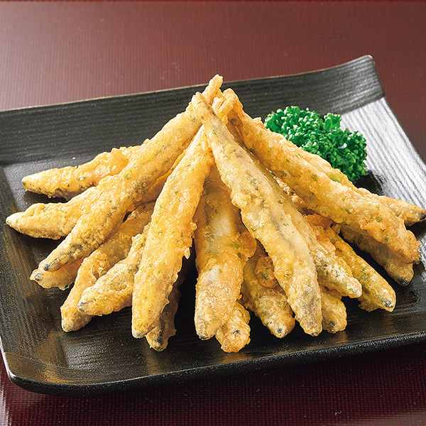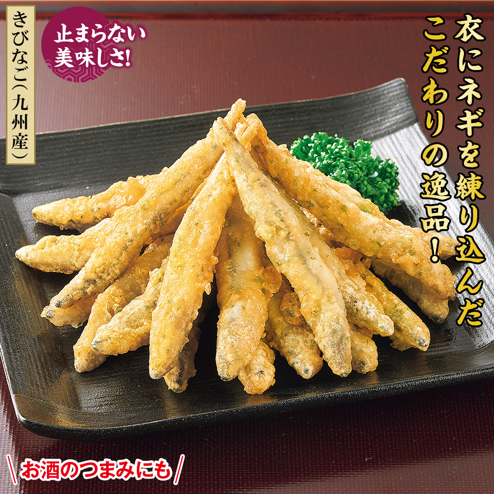 【きびなご(九州産)】 止まらない美味しさ! お酒のつまみにも。 きびなごをネギを練り込んだ衣でカリッと揚げました。 レンジで温めるだけで美味しくいただけます。