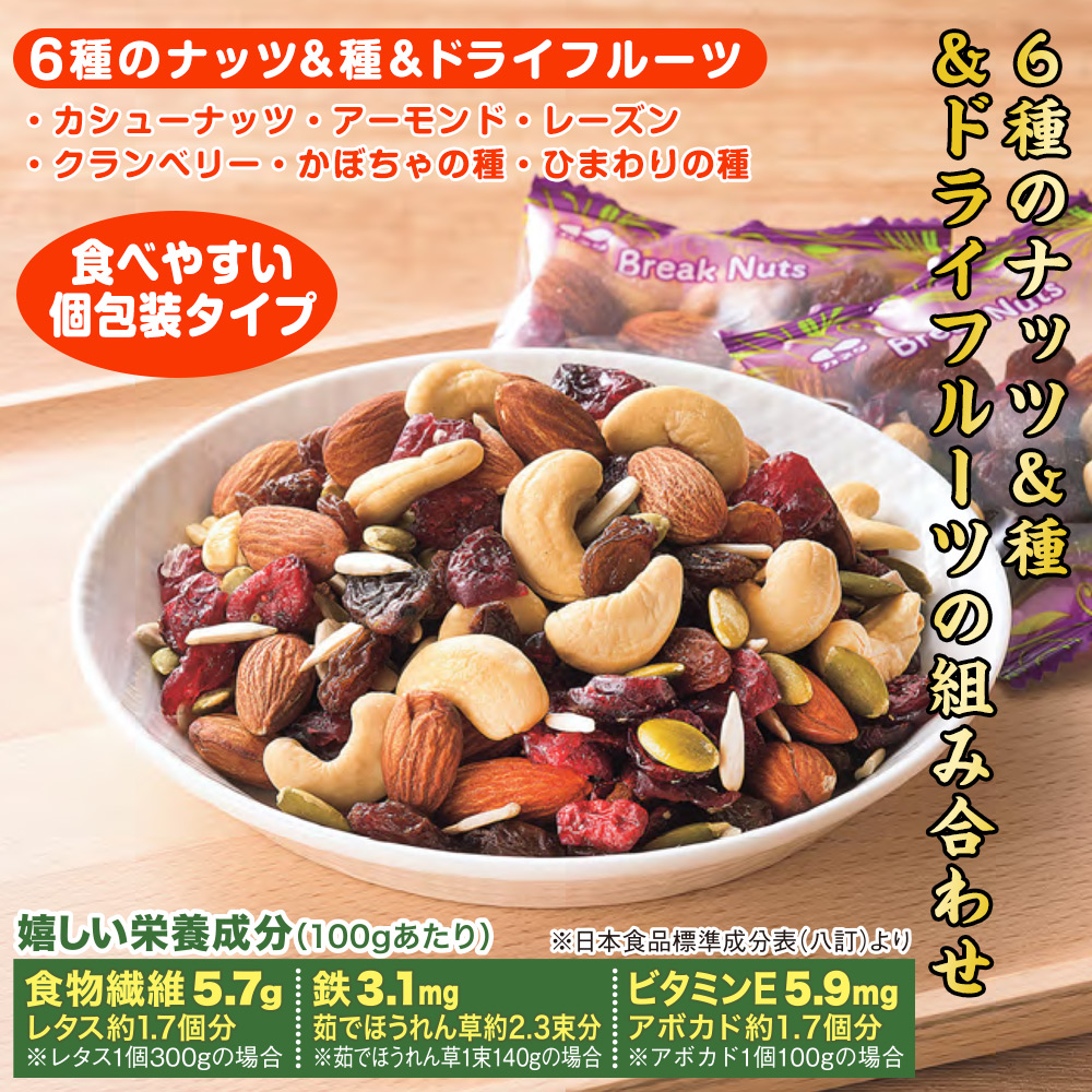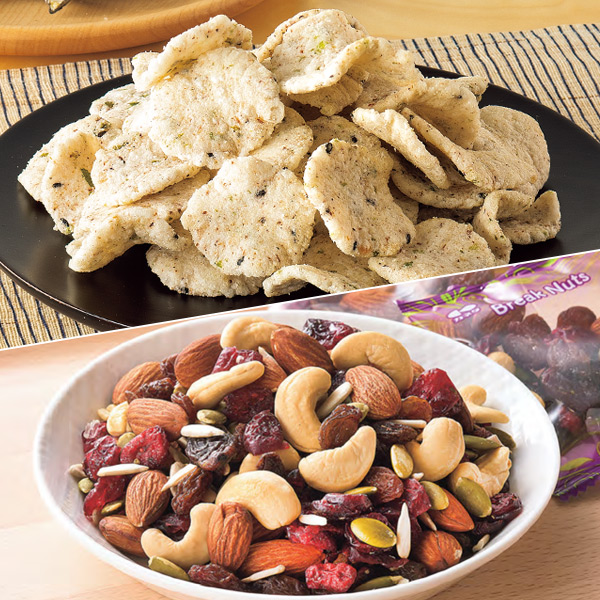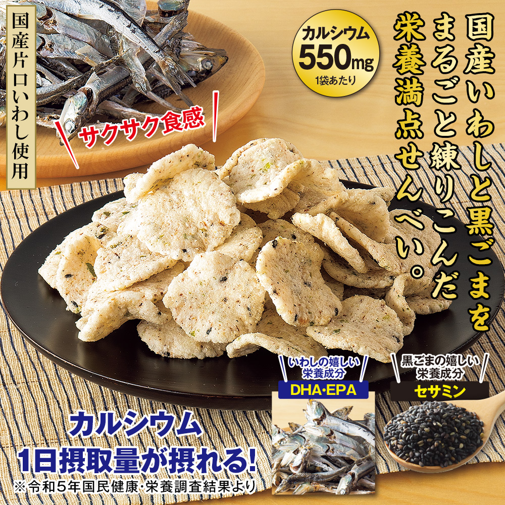 <黒胡麻いわしせんべい 栄養機能食品(カルシウム)> いわしの中でも特に美味しいといわれる片口いわしをまるごと使用。 ごまの風味と相性がよく、おいしくカルシウム補給におすすめです。 保存に便利なチャック付袋。 1袋あたりカルシウム550mg入り。 [いわしの嬉しい栄養成分] DHA・EPA [黒ごまの嬉しい栄養成分] セサミン <ブレイクナッツ> 6種のナッツ&種&ドライフルーツの組み合わせ(カシューナッツ、アーモンド、レーズン、クランベリー、かぼちゃの種、ひまわりの種) 食べやすい個包装タイプです。