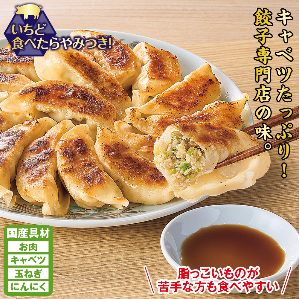 一度食べたらやみつき! 国産の4種の具材をもっちり皮で包みました。 キャベツをたっぷり使ったさっぱりとした餃子です。 ・お肉・キャベツ・玉ねぎ・にんにく