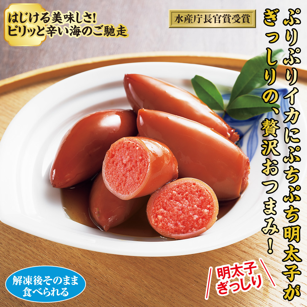はじける美味しさ! ピリッと辛い海のご馳走。 小ぶりのイカに明太子や魚卵、すり身を合わせた具をたっぷり詰めました。 甘辛醤油味でお酒がすすむ美味しさです。 明太子ぎっしり。 解凍後そのまま食べられる。 水産庁長官賞受賞。