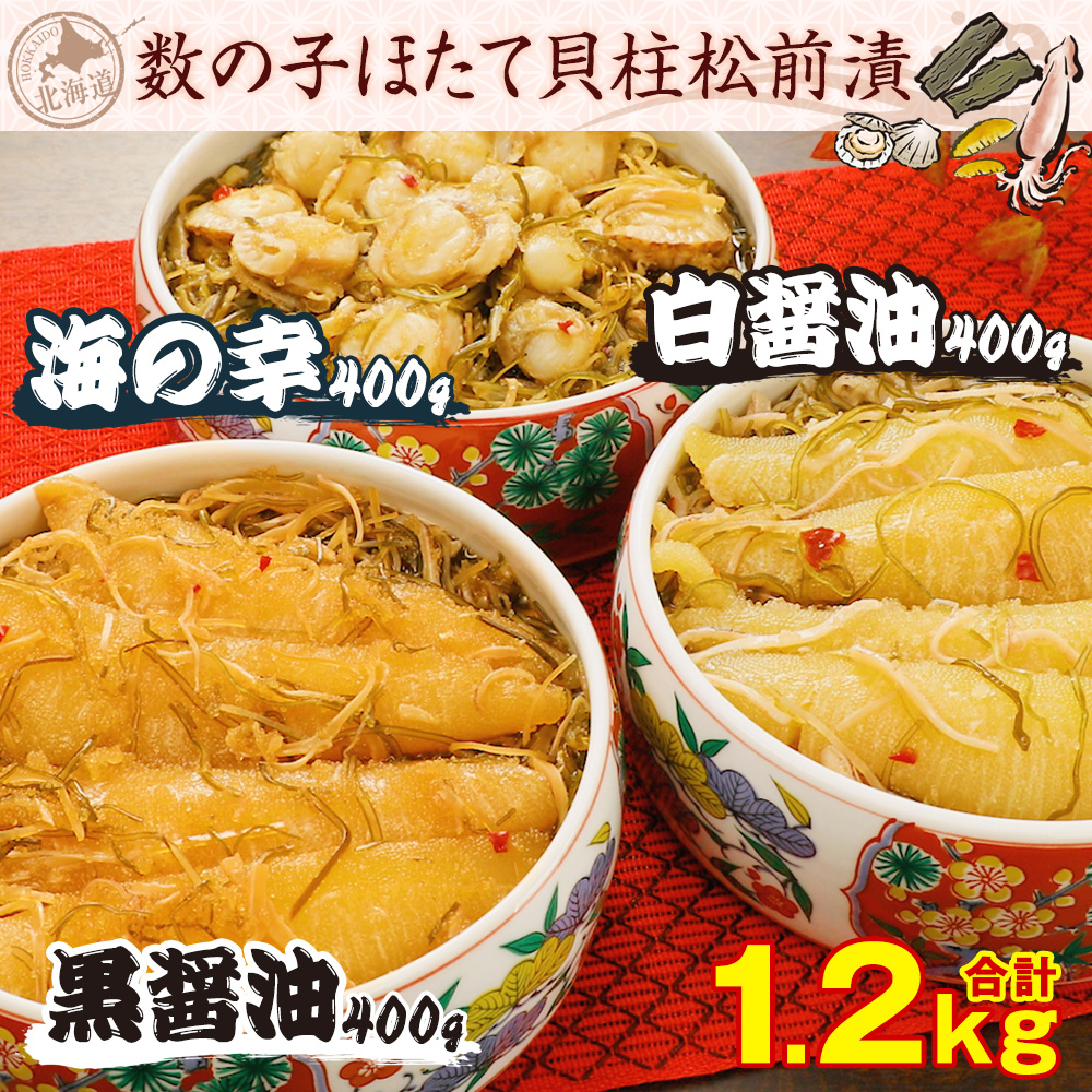 ●セット内容/<黒醤油味>400g<白醤油味>400g<海の幸松前漬>400g ●賞味期限/製造日から冷凍1年 ●加工地/日本 ●原材料/<黒醤油味>数の子(ロシア産、アメリカ産、ドイツ産)、醤油、米発酵調味料、砂糖、かつお節エキス、いか(国産)、昆布(北海道産)、がごめ昆布(北海道産)、赤唐辛子/甘味料(ソルビトール)、酒精、調味料(アミノ酸等)、増粘多糖類<白醤油味>数の子(ロシア産、アメリカ産、ドイツ産)、蛋白加水分解物、酵素糖化水飴、米発酵調味料、いか(国産)、砂糖、昆布(北海道産)、がごめ昆布(北海道)、醤油、かつお節エキス、赤唐辛子/甘味料(ソルビトール)、酒精、調味料(アミノ酸等)<海の幸松前漬>ほたて(北海道産)、アズマニシキ、数の子(ロシア、ドイツ、アメリカ)、いか(国内製造)、真昆布(北海道産)、醤油、がごめ昆布(北海道産)、米醗酵調味料、砂糖、かつお節エキス、赤唐辛子、蛋白加水分解物、/ソルビトール、調味料(アミノ酸等)、増粘多糖類(一部に大豆・小麦・いかを含む) ●特定原材料等/<黒醤油味>小麦・いか・大豆<白醤油味>小麦・いか・大豆<海の幸松前漬>小麦・いか・大豆