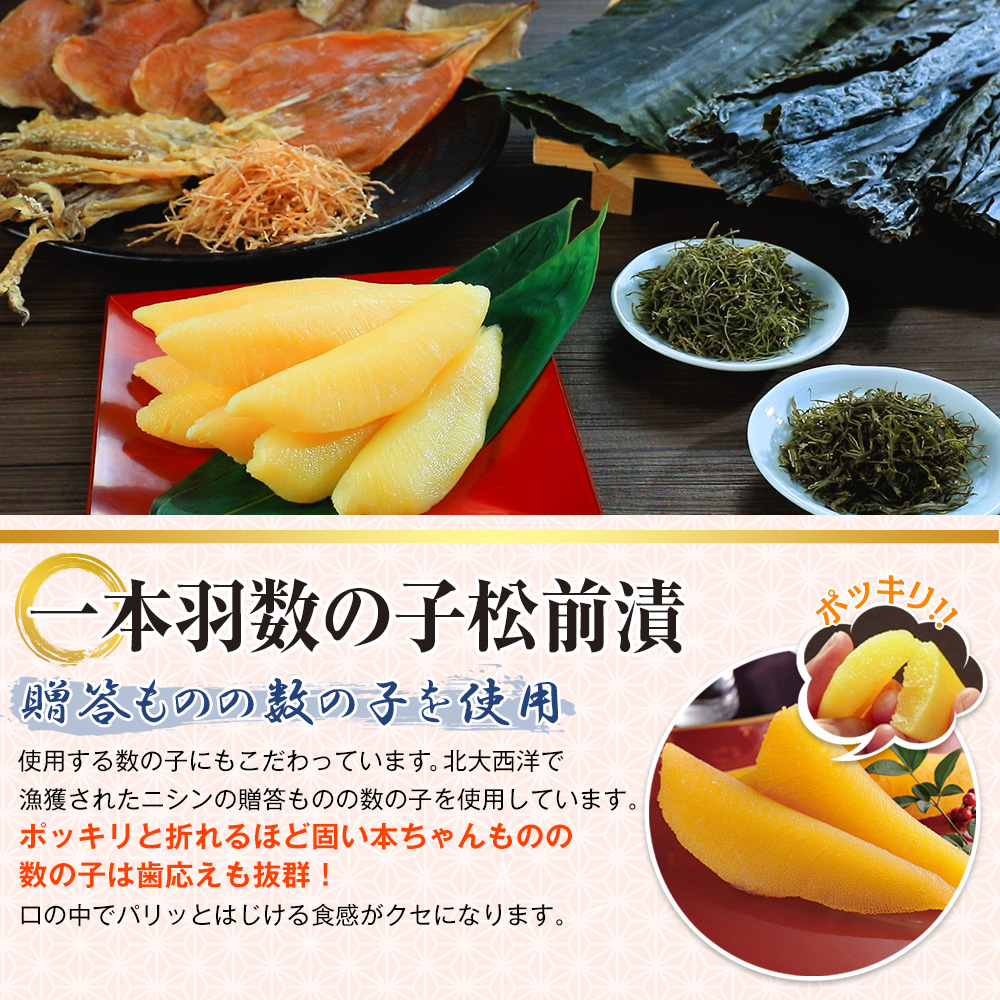 【松前漬け(黒・白)】 数の子の食感をより楽しんで頂けるよう、パリパリ・コリコリした歯ごたえの良い数の子を使用しました。 卵質の良さはご満足頂けるものと思われます。 その数の子といかと粘りのある昆布の食感と味をお楽しみ下さい。 昆布には北海道産のがごめ昆布と真昆布を使用し、こだわり抜いた松前漬。 【ホタテ松前】 北海道道南の郷土料理松前漬に数の子、ベビー帆立、貝柱をくわえた商品です。