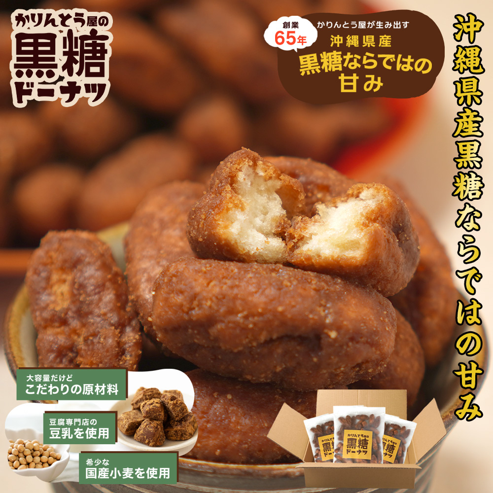 創業65年のかりんとう屋さんが生み出した黒糖ドーナツにはかりんとう屋ならではのこだわりがたくさん。 一般的なドーナツは、薄力粉を使用することがほとんどですが、このドーナツはもっちり食感を実現させるために、かりんとうに使う、中力粉を使用するなどこだわりがつまっています。 大容量だけどこだわりの原材料。 豆腐専門店の豆乳を使用。 希少な国産小麦を使用。