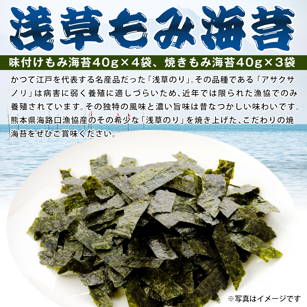 ●セット内容/<味付けもみ海苔>40g×4袋<焼きもみ海苔>40g×3袋 ●賞味期限/製造日から常温1年 ●加工地/日本 ●原材料/<味付けもみ海苔>乾海苔<焼きもみ海苔>乾海苔 ●特定原材料/<味付けもみ海苔>なし<焼きもみ海苔>なし