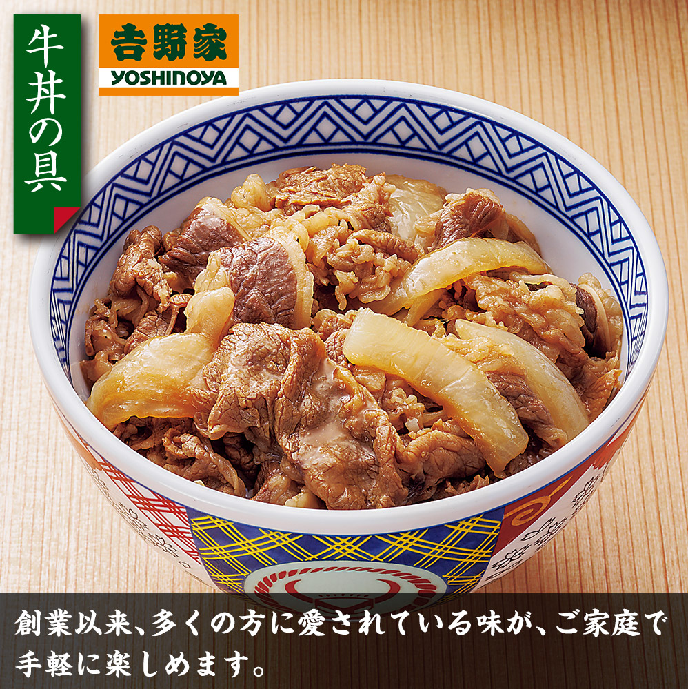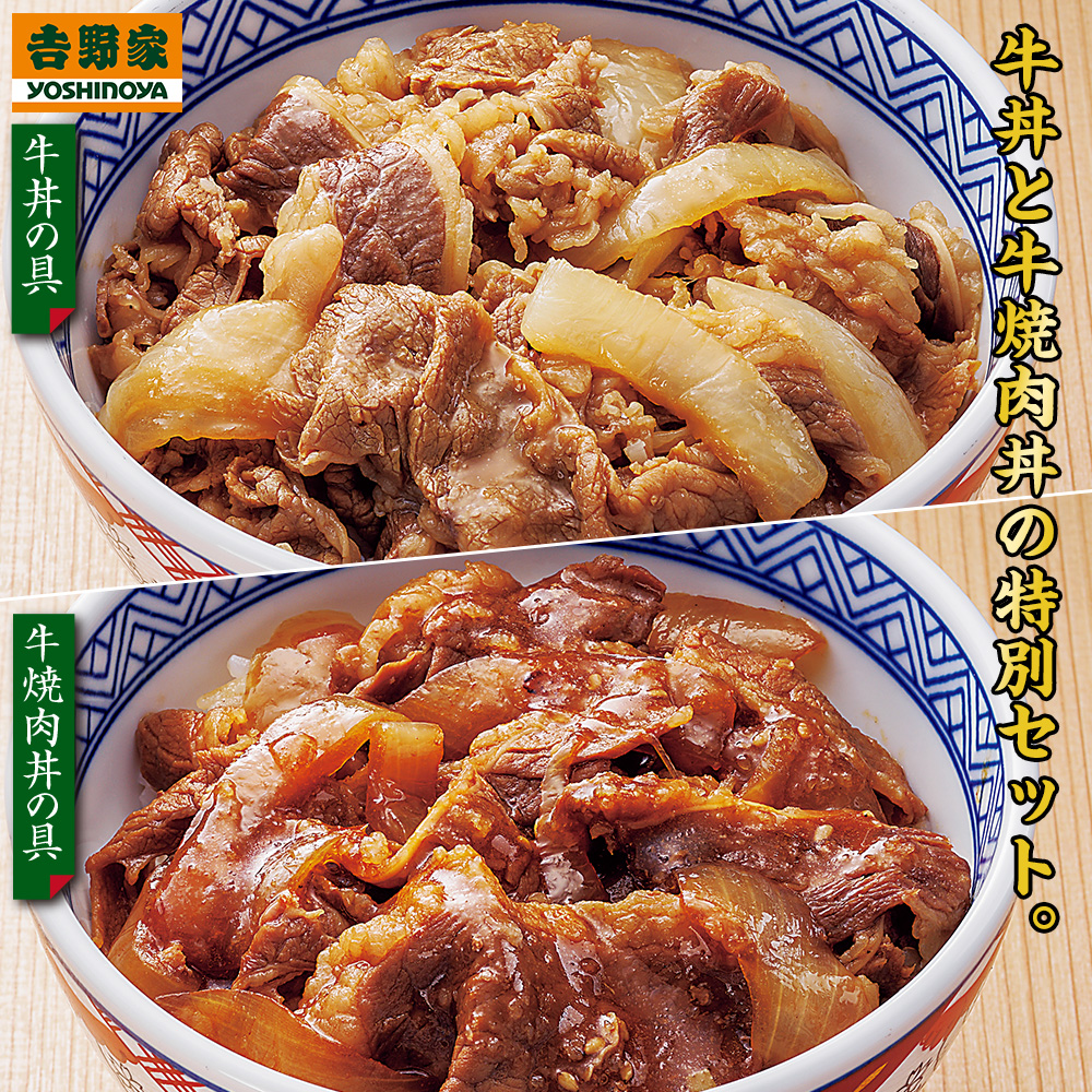 ●【牛丼の具】1袋120g 創業以来、多くの方に愛されている味が、ご家庭で手軽に楽しめます。 人気牛丼チェーン「吉野家」の牛丼の具。 ●【牛焼肉丼の具】1袋120g 焼き目をつけたボリュームたっぷりのお肉に特選の醤油タレで、より一層「うまい」牛焼肉丼に仕上げました。 吉野家ファンが絶賛する、香ばしさが食欲をそそる牛焼肉丼をご家庭でお楽しみください。 ※レンジでも湯煎でも手軽に作れます。 ※忙しいときの昼食・夕食に!冷凍しておけば1年もつので長期保存も可能。 いつでも食べたい時に吉野家の味が楽しめます。