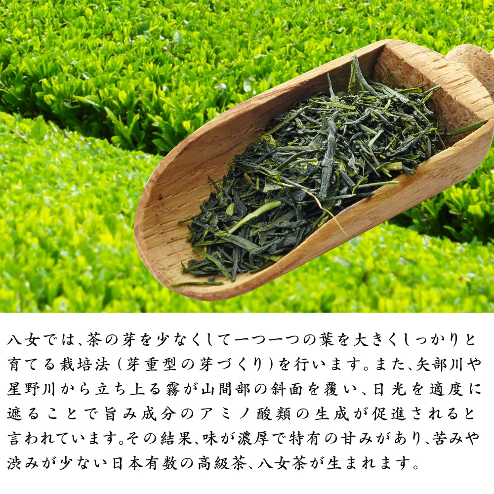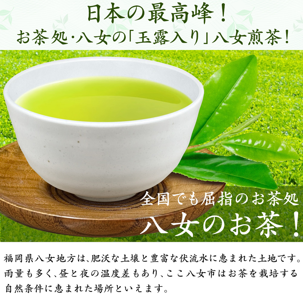 ■全国でも屈指のお茶処・八女のお茶! 福岡県八女地方は、肥沃な土壌と豊富な伏流水に恵まれた土地です。雨量も多く、昼と夜の温度差もあり、ここ八女市はお茶を栽培する自然条件に恵まれた場所といえます。 また、矢部川や星野川から立ち上る霧が山間部の斜面を覆い、日光を適度に遮ることで旨み成分のアミノ酸類の生成が促進されると言われています。 その結果、味が濃厚で特有の甘みがあり、苦みや渋みが少ない日本有数の高級茶、八女茶が生まれます。 ■「日本茶の最高峰」と称される八女の玉露をブレンド! 八女の玉露は、全国茶品評会において22年連続で「産地賞」を受賞。 さらには4年連続で「農林水産大臣賞」も受賞。 そんな最高峰の八女の玉露をブレンド。 あまくてまろやかなコクのあるお茶に仕上がります。