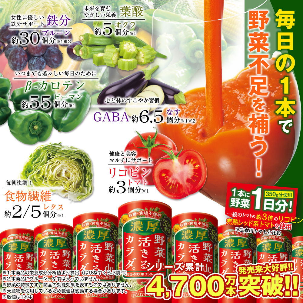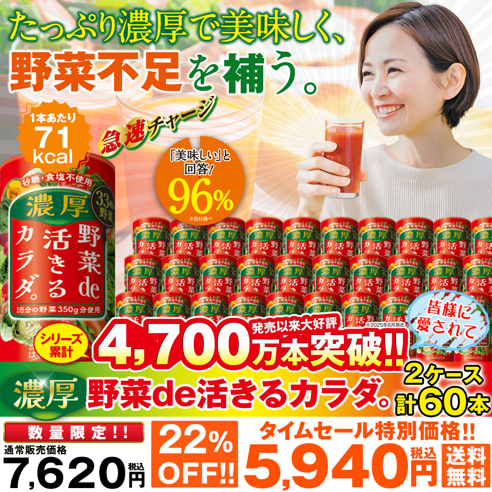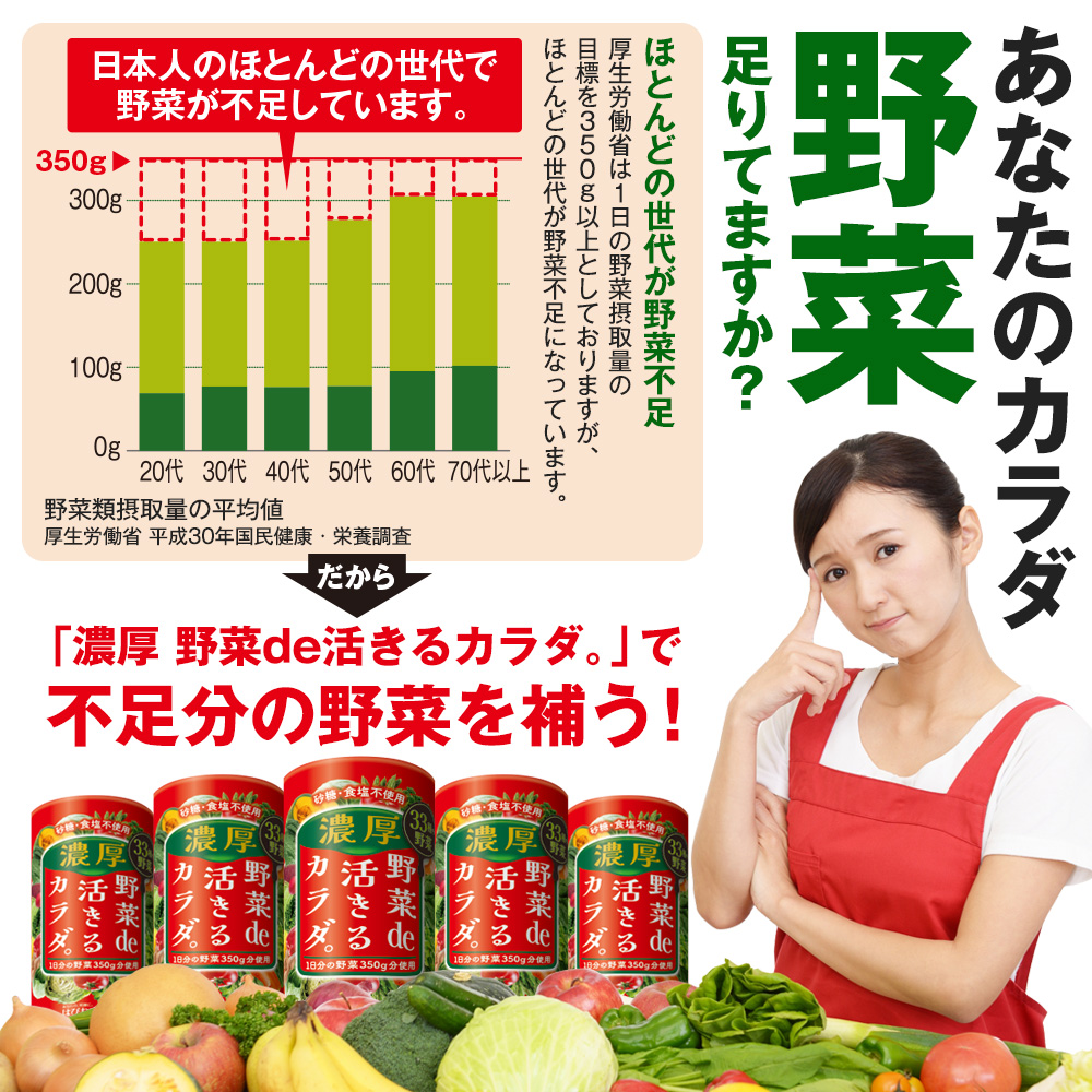 濃厚野菜de活きるカラダ。のこだわりポイント 【濃い!】 1本125gに約3倍の野菜350g分をギュッと凝縮 トロっと濃厚で、まるで果物ジュースのような味わい。 【33種類の野菜を使用】 栄養のバランスを考えて、果菜、葉菜、根菜をバランスよく厳選。 【ゴミ出し簡単、環境に優しいエコ容器を採用】 軽くて簡単に潰せるエコ容器(カート缶)を採用。 普段の食生活の栄養の偏りが気になる方に、1本プラスするだけで栄養バランスがぐっと整います! ★こんなときにおすすめ ・外食、コンビニ弁当を利用する機会の多い方 ・野菜を普段あまり食べない方、野菜が苦手な方 ・ダイエット中の方 ・生野菜の高騰時の代替品として