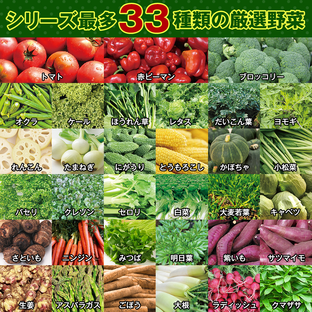 栄養のバランスを考えて、果菜、葉菜、根菜をバランスよく33種類を厳選。 [食塩不使用][砂糖不使用][香料不使用][着色料不使用][保存料不使用][甘味料不使用]