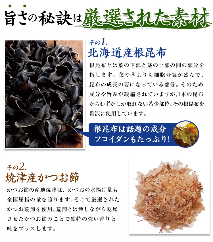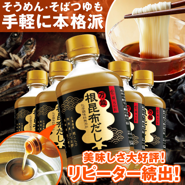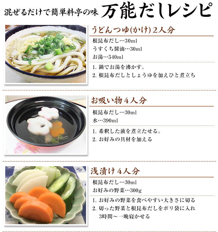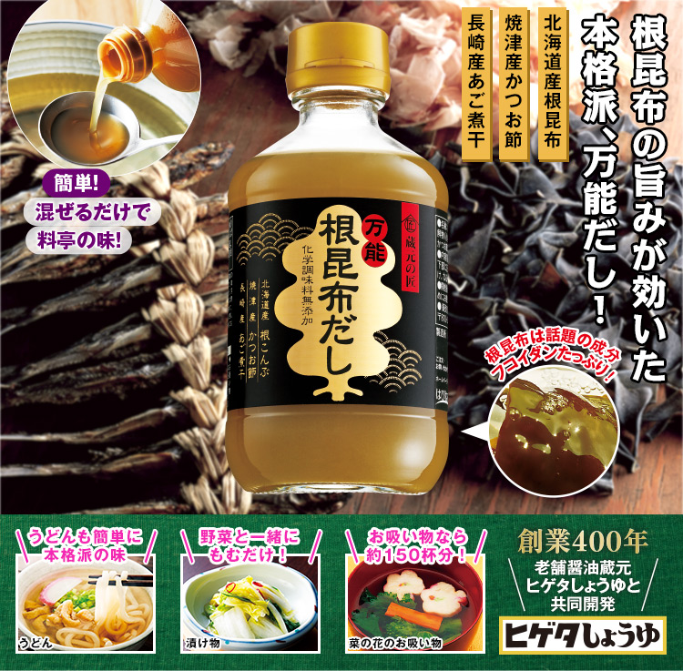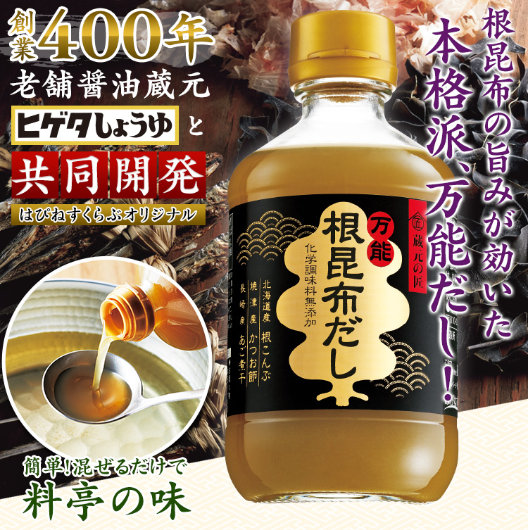 はぴねすくらぶオリジナル! 創業400年老舗醤油蔵元ヒゲタしょうゆと共同開発! ・北海道産根昆布・焼津産かつお節・長崎産あご煮干 根昆布の旨みが効いた本格派、万能だし! 簡単!混ぜるだけで料亭の味。 貴重な北海道産根昆布をはじめ、国産の厳選素材にこだわった万能液体だしです。 水やお湯に混ぜるだけで、手軽に本格派の味を堪能できます。 ■根昆布とは? 昆布が生長する起点となる根っこの部分のこと。 「フコイダン」などの栄養や旨みが凝縮しています。 ・うどん うどんも簡単に本格派の味! ・漬け物 野菜と一緒にもむだけ! ・菜の花のお吸い物 お吸い物なら約150杯分!
