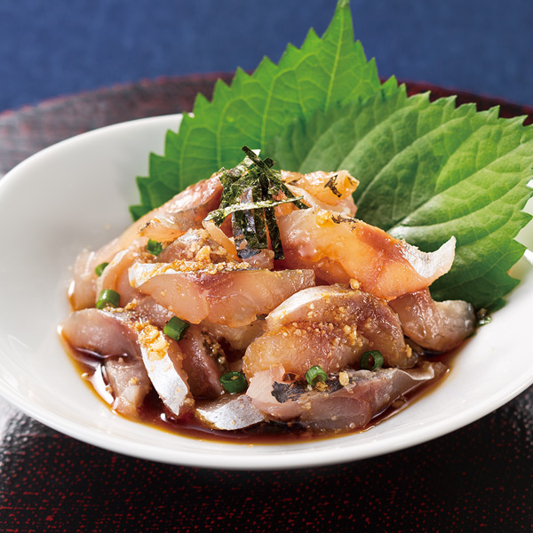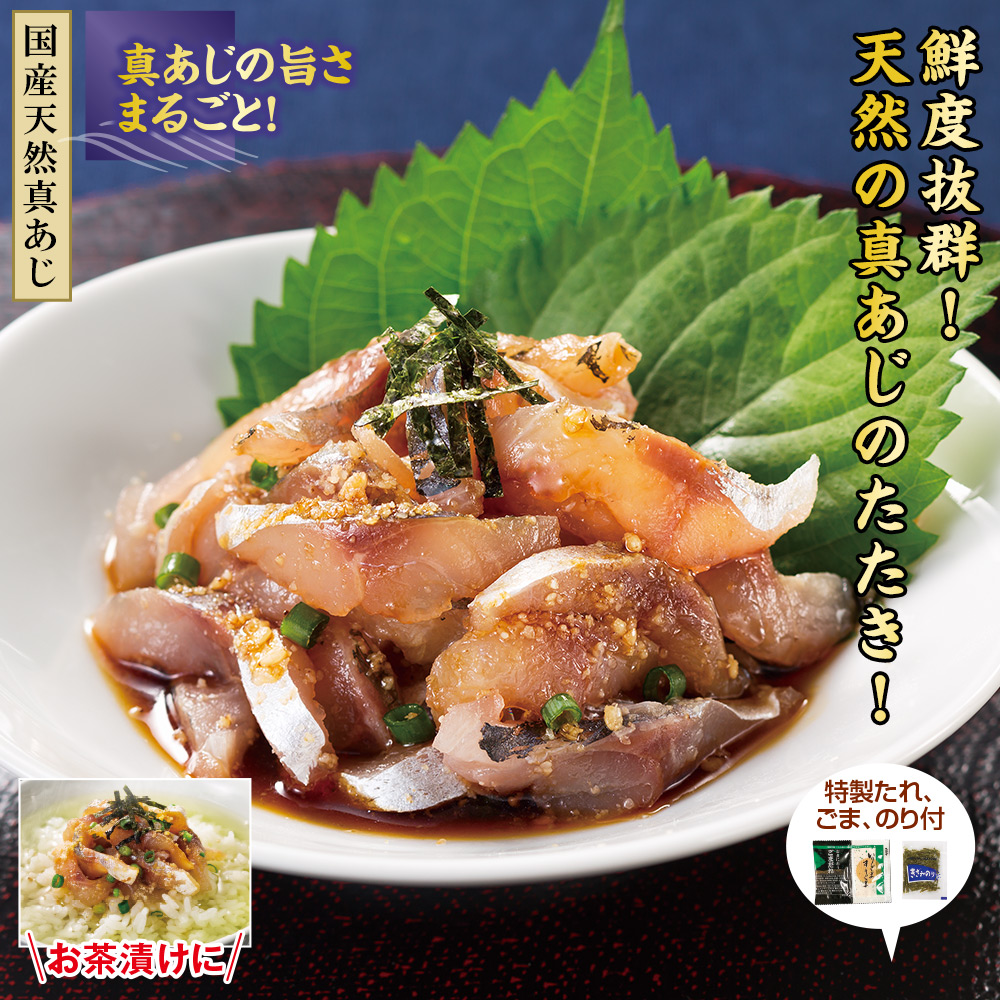 鮮度抜群!天然の真あじのたたき! 新鮮な天然の真あじを水揚げ直後に加工し冷凍。 非常に鮮度の高い商品です。 特製のごまだれ付でお届けします。 真あじの旨さまるごと! ◎国産天然真あじ使用