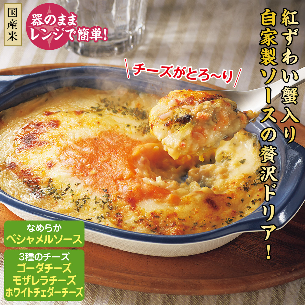 紅ずわい蟹入り自家製ソースの贅沢ドリア! 玉葱やパプリカ、チキンコンソメを加えたライスに、こだわりの紅ずわい蟹入りソースをトッピング。 旨味が広がります。 器のままレンジで簡単! チーズがとろ~り。 なめらか ベシャメルソース 3種のチーズ ゴーダチーズ モザレラチーズ ホワイトチェダーチーズ