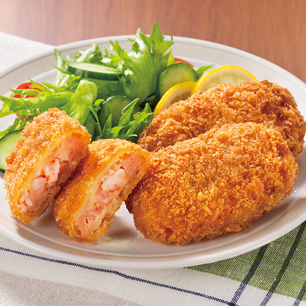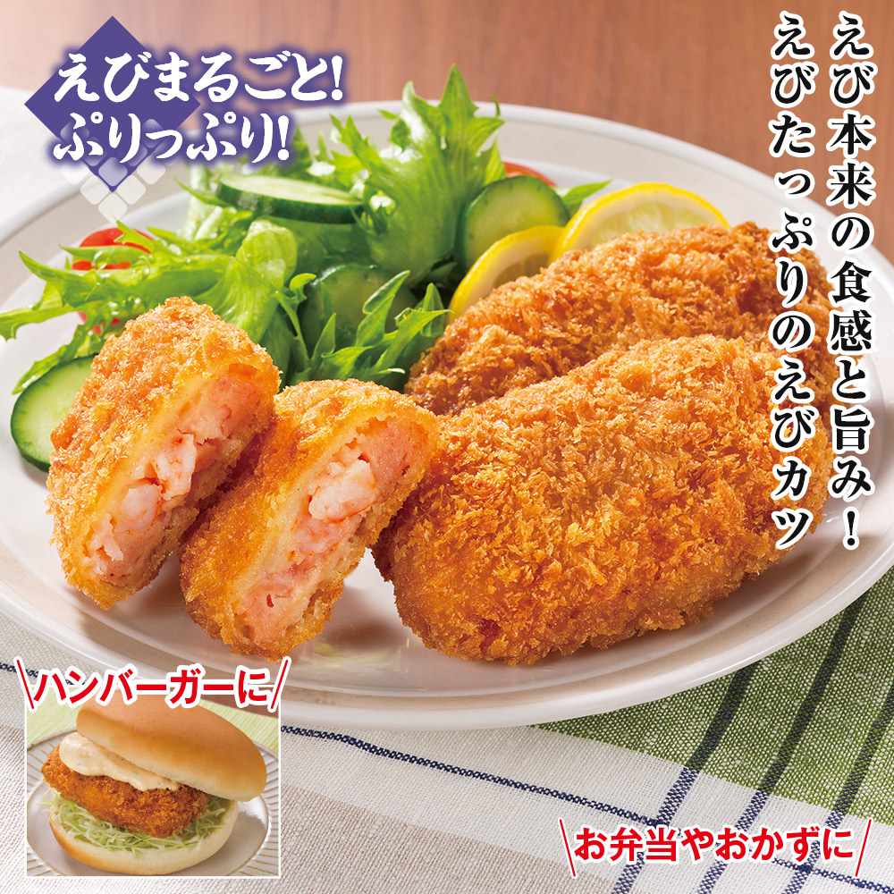 えびをつぶさずにたっぷりと使った油調理済みのえびカツです。 えび本来の旨みと衣のサクサク食感をお楽しみください。 えびまるごと!ぷりっぷり! ハンバーガーにも!