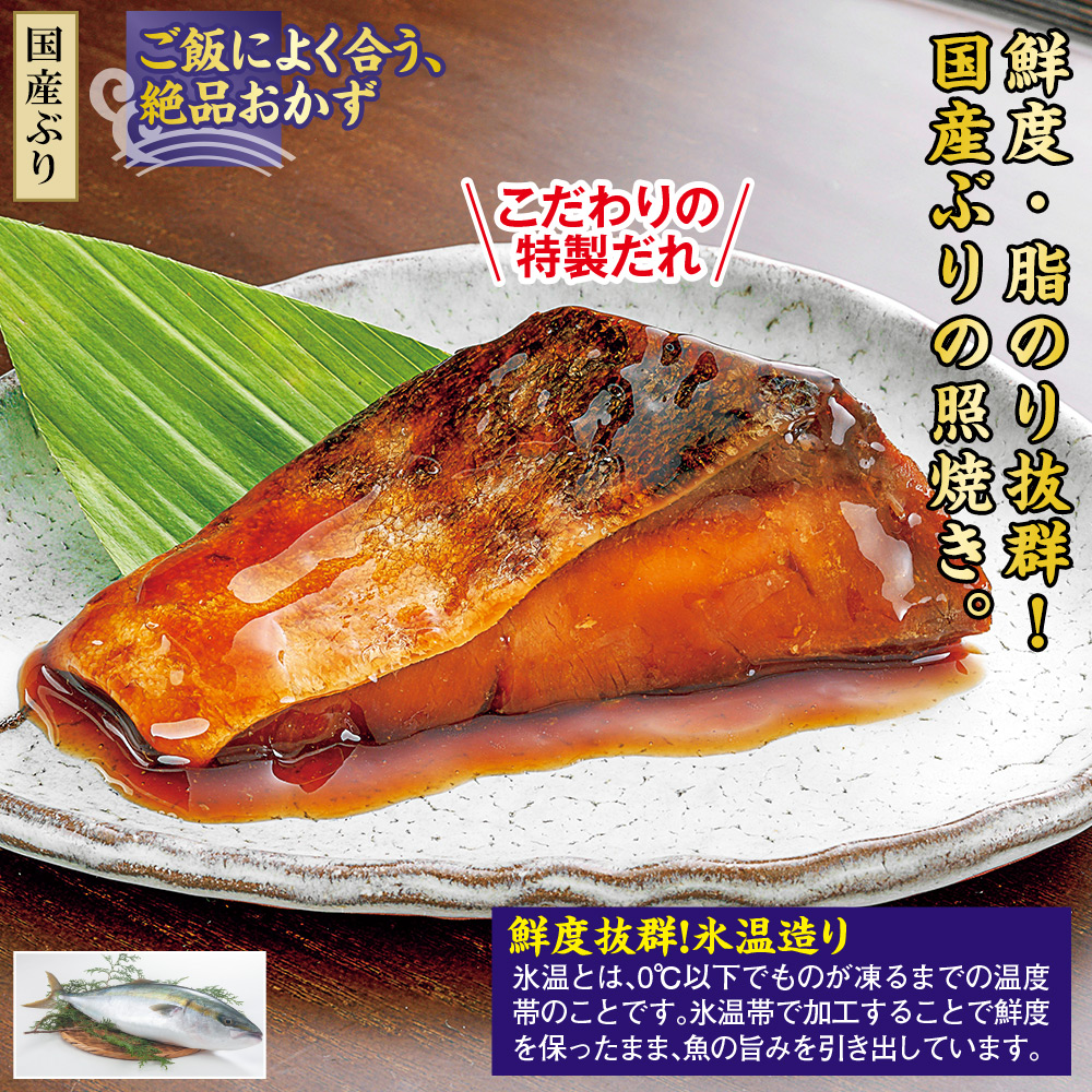 【国産 ぶり】 醤油漬けにした国産の天然ぶりを香ばしく焼き上げ、特製たれに絡めて照焼きにしました。 ご飯によく合う、絶品おかず こだわりの特製だれ! 鮮度抜群!氷温造り 氷温とは、0℃以下でものが凍るまでの温度帯のことです。 氷温帯で加工することで鮮度を保ったまま、魚の旨みを引き出しています。