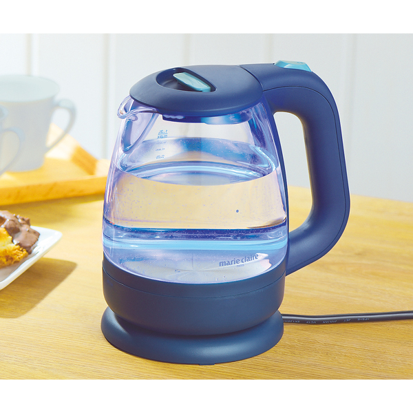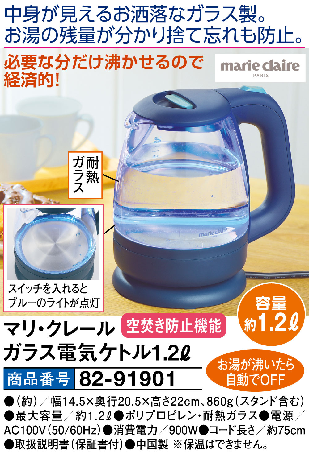中身が見えるお洒落なガラス製!お湯の残量が分かり捨て忘れも防止! スイッチを入れるとブルーのライトが点灯 お湯が沸いたら自動でOFF ※保温はできません ●耐熱ガラス ●空焚き防止機能