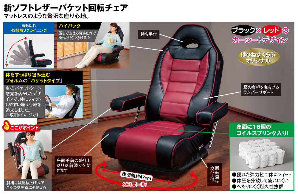 弾力性、耐久性に優れ長時間座ってもラク! ブラック×レッドのカーシートデザイン 【ハイバック】 頭まで支える背もたれでゆったりくつろげる♪ 【体をすっぽり包み込むフォルムの「バケットタイプ」】 車のバケットシート感覚を活かしたデザインで、体にフィットしやすい座り心地を追求しました。 背もたれ42段階リクライニング 【座面に16個のコイルスプリング入り!】 ・優れた弾力性で体にフィット ・体圧を分散して疲れにくい ・へたりにくく耐久性抜群 【ここがポイント】 肘掛けは跳ね上げ式で立ち座りがラク♪ 腰の負担を和らげるランバーサポート 座面手前の盛り上がりが前滑りを防ぎます ●持ち手付 ●回転盤はカバー付 ●360度回転