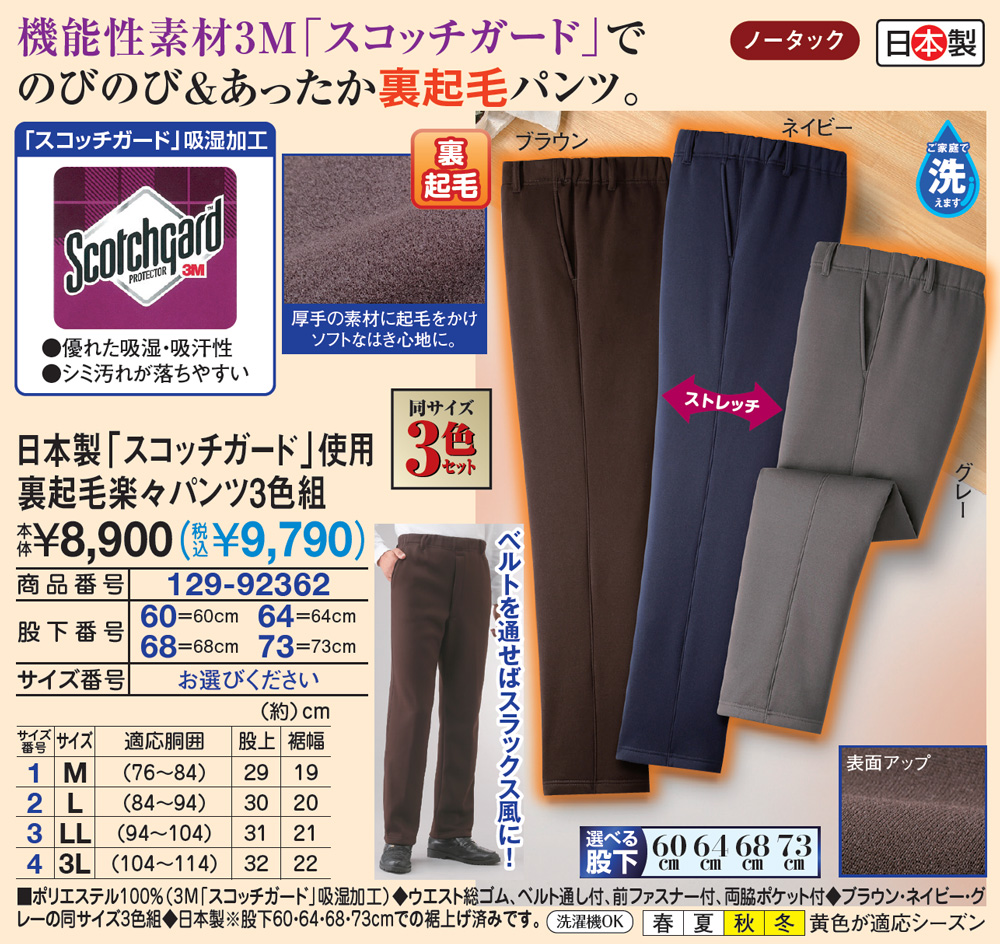 日本製「スコッチガード」使用裏起毛楽々パンツ3色組