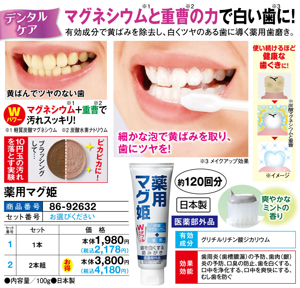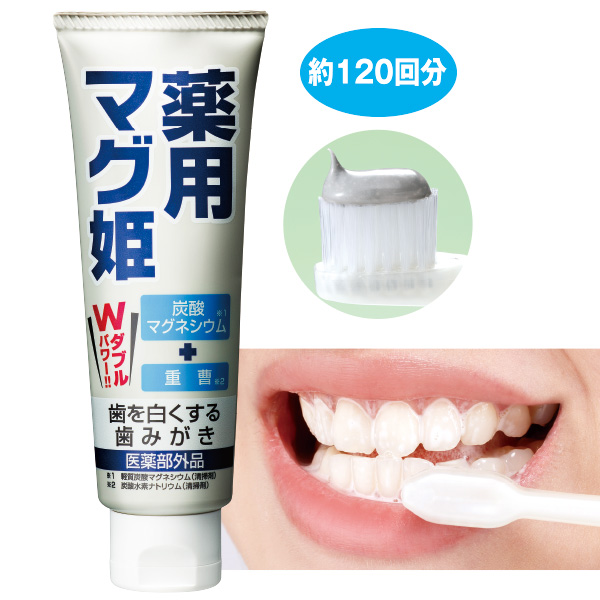 マグネシウム※1と重曹※2の力で白い歯に! 有効成分で黄ばみを除去し、白くツヤのある歯に導く薬用歯磨き。 Wパワー! 炭酸マグネシウム※1+重曹※2でこびりついた汚れをごっそり! ●使い続けるほど白い歯と健康な歯ぐきに! 黄ばんで凸凹がある歯。歯ぐきに傷みも 細かな泡で黄ばみを取り、表面の凸凹も埋まる。 ツヤのある白い歯に!歯ぐきも健康に。 ●効果効能 歯周炎(歯槽膿漏)の予防、歯肉(齦)炎の予防、口臭の防止、歯を白くする、口中を浄化する、口中を爽快にする、むし歯を防ぐ ●有効成分 グリチルリチン酸 ジカリウム ※1 軽質炭酸マグネシウム ※2 炭酸水素ナトリウム