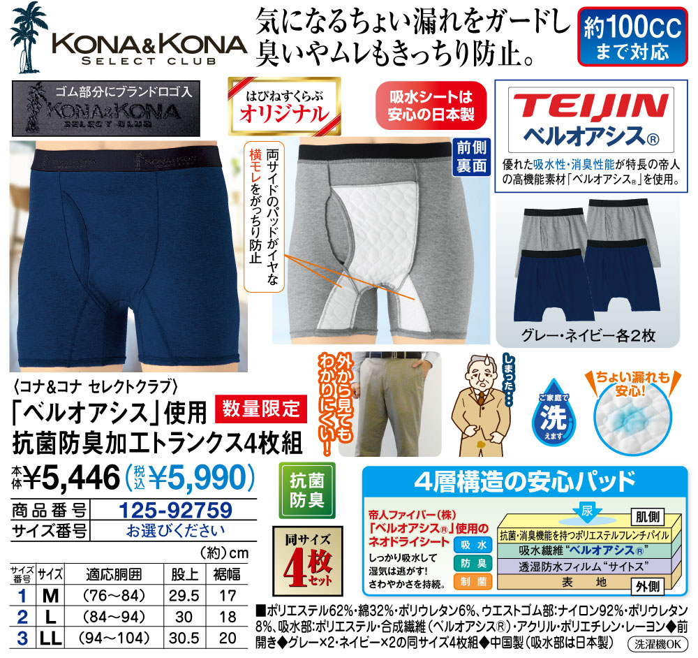 尿モレをしっかりガードし、臭いやムレもきっちり防止! ●快適フィットのボクサータイプトランクス ●ストレッチ 外から見てもわかりにくい! ●抗菌・防臭のちょいモレ対応で安心。 ●吸水シートは安心の日本製 【安心のパッド内蔵。】 ちょいモレも安心 安心の約100CCまで対応 【帝人ファイバー(株)「ベルオアシス(R)」使用のネオドライシート】 しっかり吸水して、湿気は閉じ込めない!さわやかさを持続。 ●吸水●防臭●制菌 ●ご家庭で洗えます ●はぴねすくらぶオリジナルブランド ●同サイズ4枚セット ●抗菌防臭 ●横モレパッドがイヤな横モレをがっちり防止 ●前開き仕様