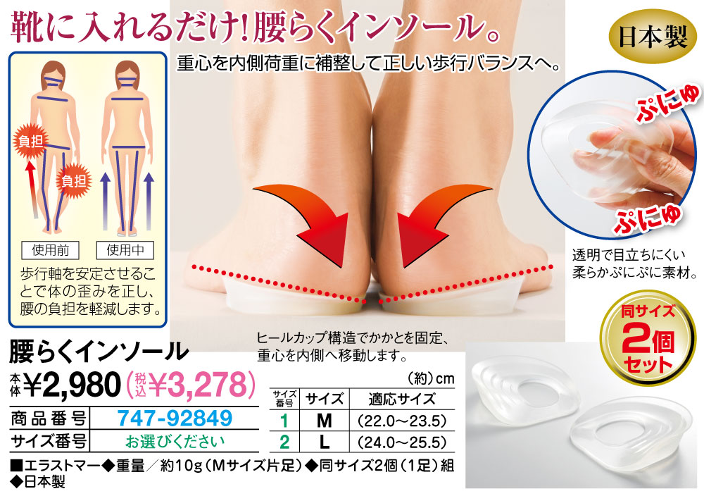 靴に入れるだけ!腰らくインソール! 重心を内側荷重に補整して正しい歩行バランスへ。 透明で目立ちにくい柔らかぷにぷに素材。 ヒールカップ構造でかかとを固定、重心を内側へ移動します。 歩行軸を安定させることで体の歪みを正し、腰の負担を軽減します。 ●同サイズ2個セット
