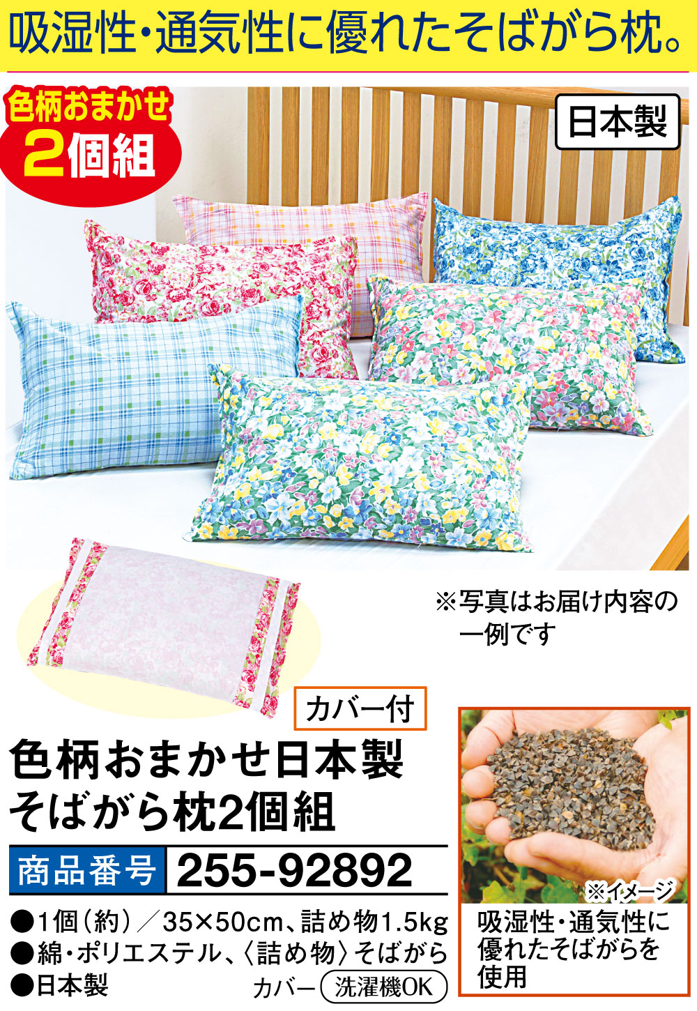 沈み込みにくく、吸湿性・通気性に優れる日本製のそばがら枕! 吸湿性・通気性に優れたそばがらを使用 ●色柄おまかせ2個組 ●カバー付