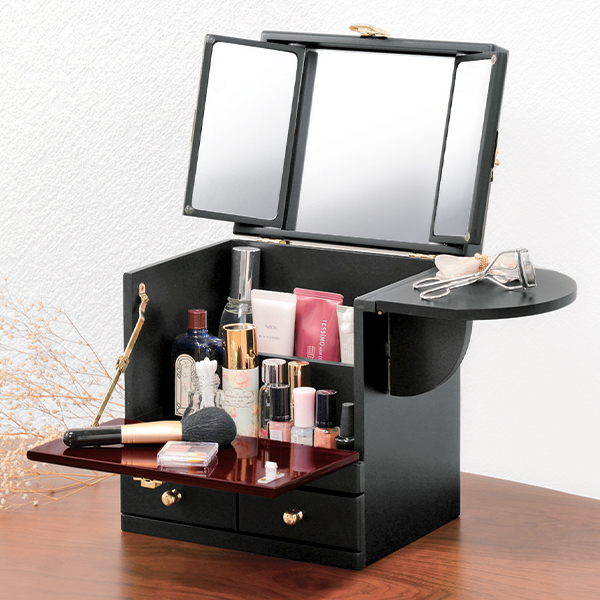 三面鏡とミニテーブルが付いた使いやすいコスメボックス。