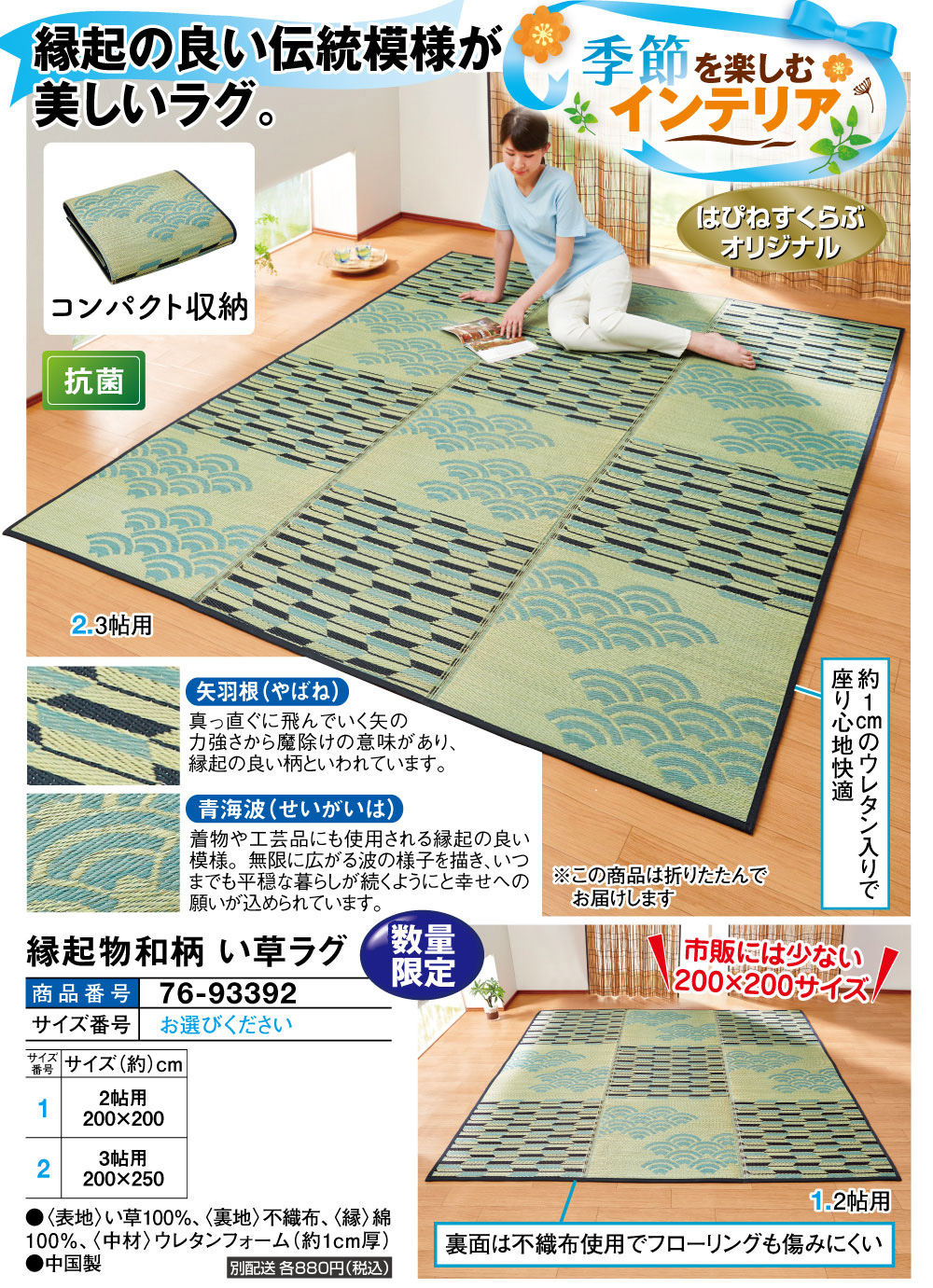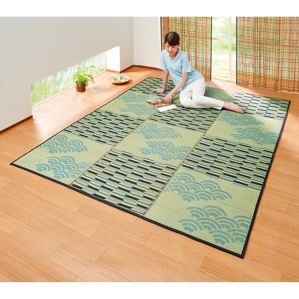 縁起の良い伝統模様が美しいウレタン入りのい草ラグ! 青海波(せいがいは) の模様は着物や工芸品にも使用される縁起の良い模様。 無限に広がる波の様子を描き、いつまでも平穏な暮らしが続くようにと幸せへの願いが込められています。 矢羽根(やばね) の模様は真っ直ぐに飛んでいく矢の力強さから魔除けの意味があり、縁起の良い柄といわれています。 裏面は不織布使用でフローリングも傷みにくい コンパクト収納