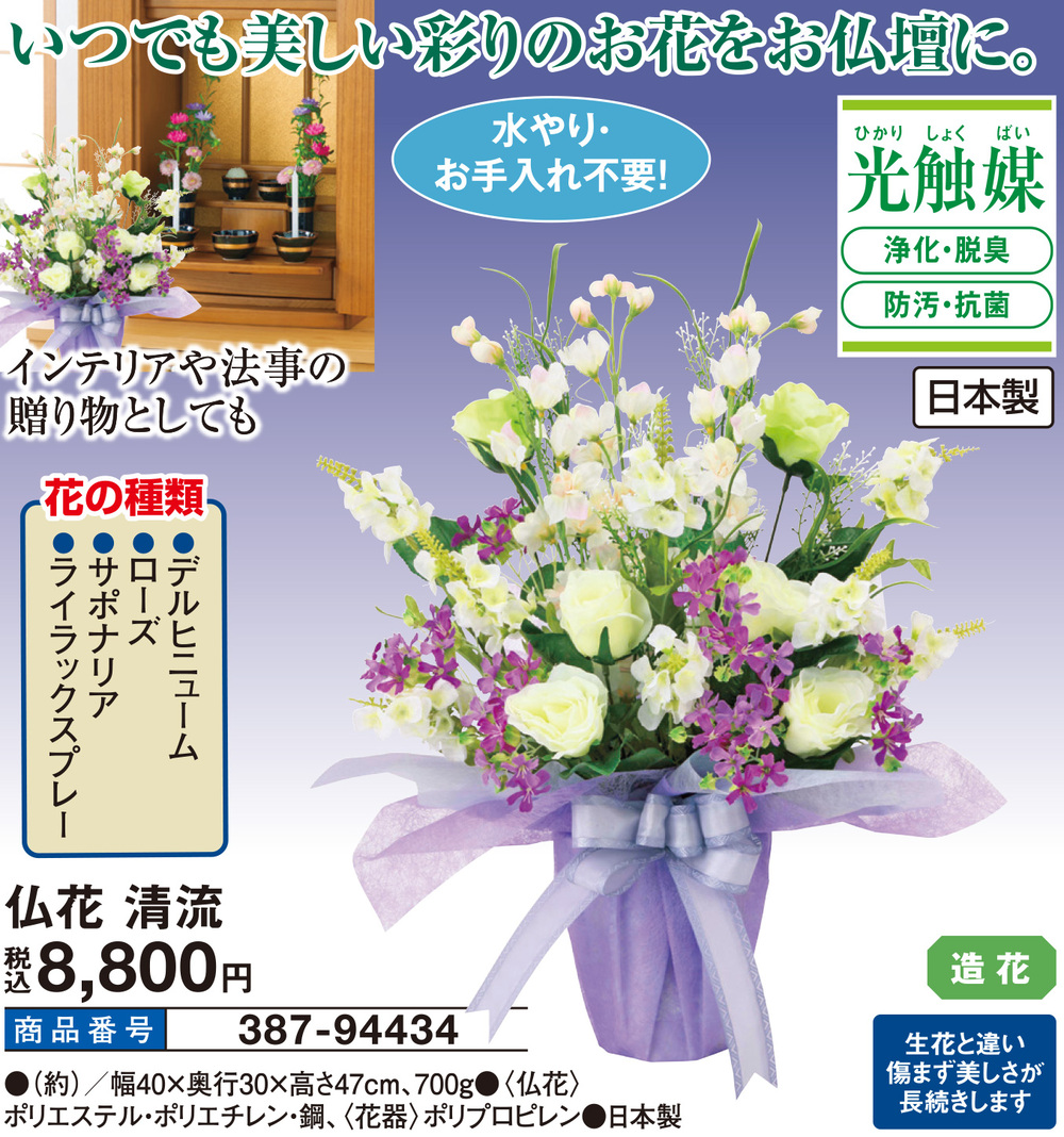 いつでも美しい彩りのお花をお仏壇に! まるで生花のような精巧な作りが魅力です。 生花と違い傷まず美しさが長続きします ●造花 【光触媒】 ●浄化・脱臭 ●防汚・抗菌 水やり・お手入れ不要! インテリアや法事の贈り物としても 【花の種類】 ・デルヒニューム・ローズ・サポナリア・ライラックスプレー
