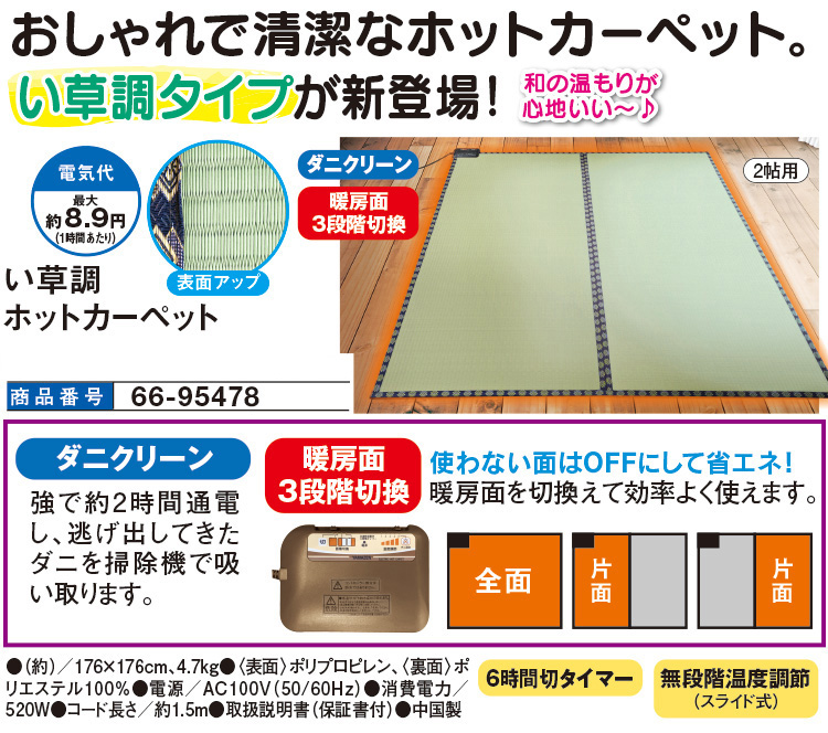 和の温もりが心地いい~♪ 暖房面3段階切換 使わない面はOFFにして省エネ! 暖房面を切換えて効率よく使えます。 ダニクリーン 強で約2時間通電し、逃げ出してきたダニを掃除機で吸い取ります。 ●5段階温度調節(スライド式) ●6時間切タイマー