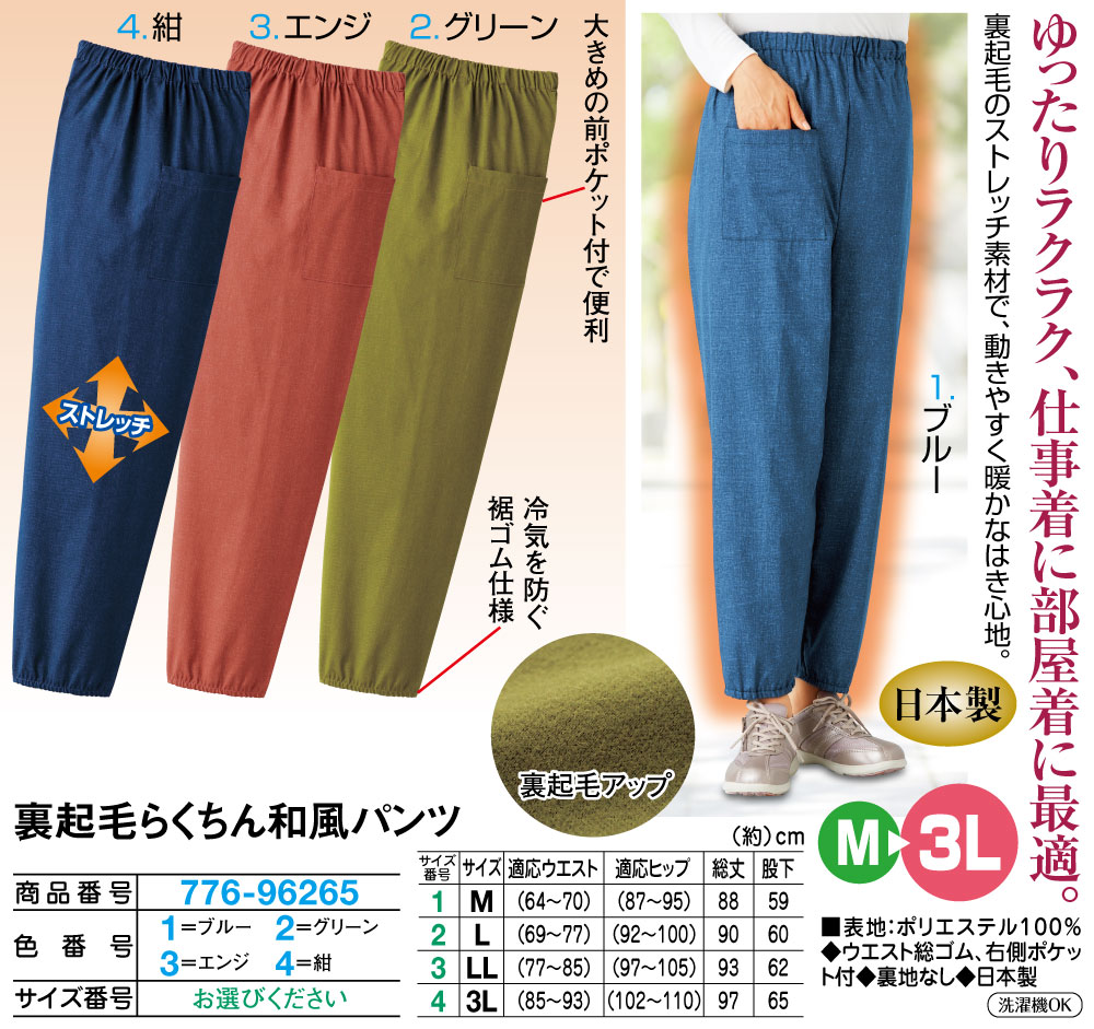 ◆ウエスト総ゴム、右側ポケット付、裾ゴム