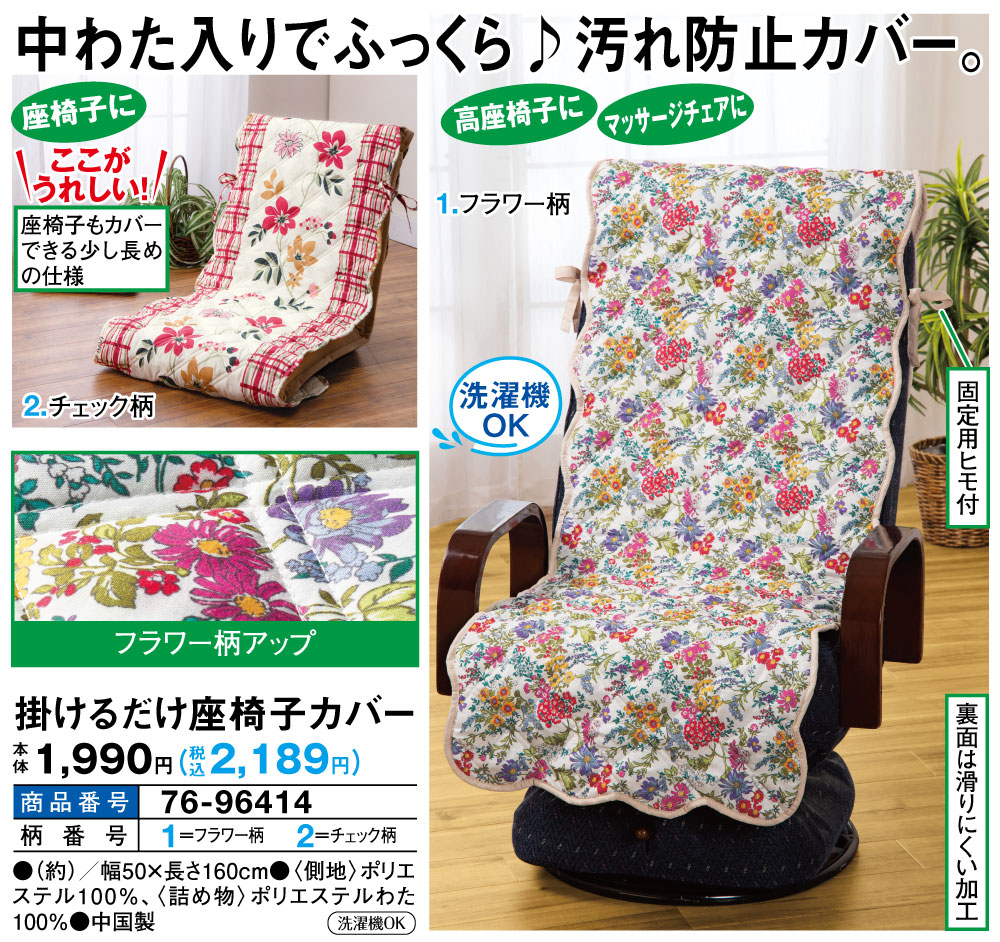 中わた入りでふっくら♪汚れ防止カバー! ここがうれしい! 座椅子もカバーできる少し長めの仕様。 固定用ヒモ付。 裏面は滑りにくい加工。 ●座椅子に ●高座椅子に ●マッサージチェアに