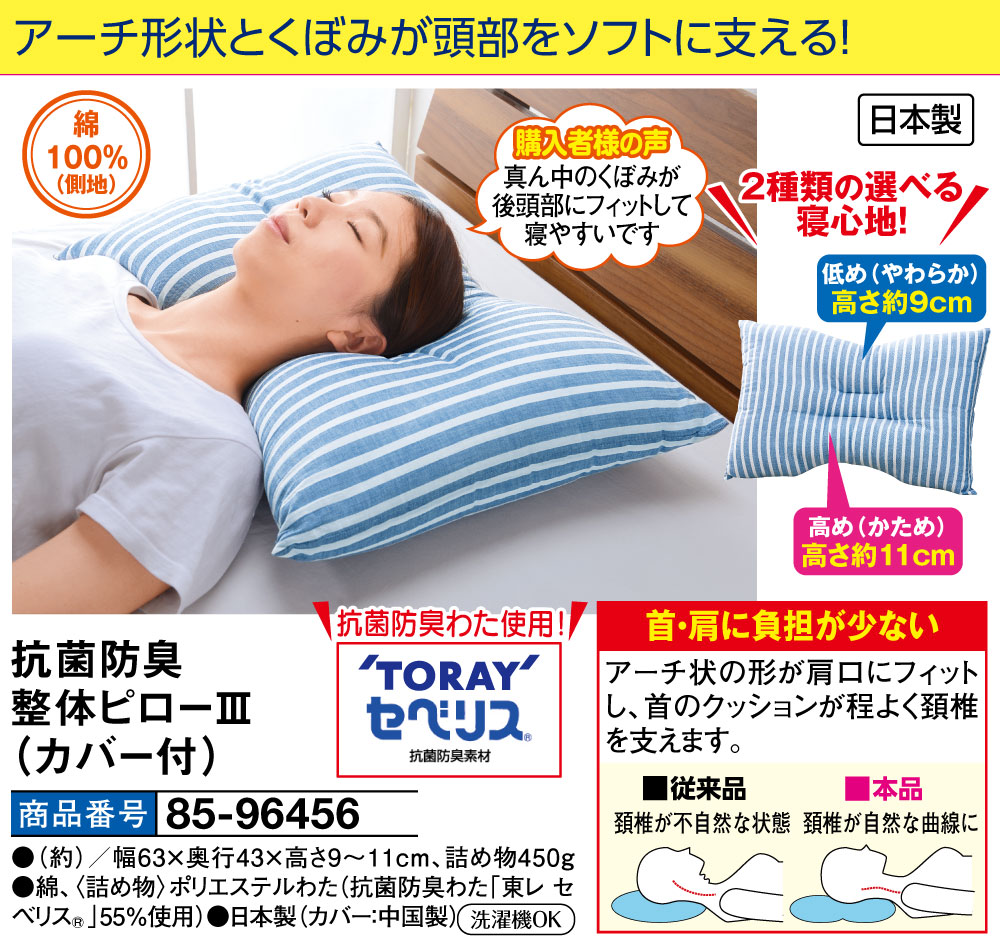 アーチ形状と中央のくぼみが頭部をソフトに支える!抗菌防臭わたに専用カバーも付いた快適枕! 首と肩の負担を軽減! 【首・肩に負担が少ない】 アーチ状の形が肩口にフィットし、首のクッションが程よく頚椎を支えます。 2種類の選べる寝心地! 低め(やわらか)高さ約9cm 高め(かため)高さ約11cm 購入者様の声:真ん中のくぼみが後頭部にフィットして寝やすいです 抗菌防臭わた使用! TORAYセベリス(R)抗菌防臭素材 ●綿100%(側地)