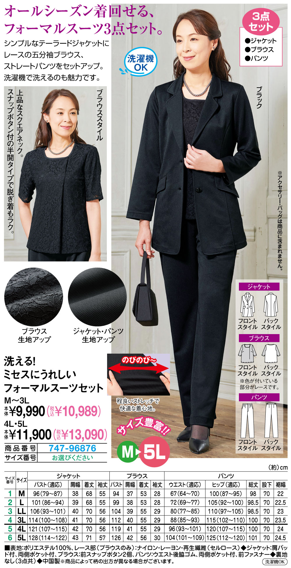ジャケット【サイズ(約)】 バスト(適応)、肩幅、着丈、袖丈 <M>96(79~87)cm、38cm、68cm、55cm <L>101(86~94)cm、39cm、68cm、55cm <LL>106(93~101)cm、40cm、70cm、56cm <3L>114(100~108)cm、41cm、70cm、56cm <4L>121(107~115)cm、42cm、70cm、56cm <5L>128(114~122)cm、43cm、71cm、57cm ブラウス【サイズ(約)】 バスト、肩幅、着丈、袖丈 <M>94cm、37cm、53cm、28cm <L>99cm、38cm、53cm、28cm <LL>104cm、39cm、55cm、29cm <3L>112cm、40cm、55cm、29cm <4L>119cm、41cm、55cm、29cm <5L>126cm、42cm、56cm、30cm パンツ【サイズ(約)】 ウエスト(適応)、ヒップ(適応)、総丈、股下、裾幅 <M>67(64~70)cm、100(87~95)cm、98cm、70cm、22cm <L>72(69~77)cm、105(92~100)cm、98.5cm、70cm、22.5cm <LL>80(77~85)cm、110(97~105)cm、98.5cm、70cm、23cm <3L>88(85~93)cm、115(102~110)cm、100cm、70cm、23.5cm <4L>96(93~101)cm、120(107~115)cm、100cm、70cm、24cm <5L>104(101~109)cm、125(112~120)cm、101cm、70cm、24.5cm ■表地:ポリエステル100%、レース部(ブラウスのみ):ナイロン・レーヨン・再生繊維(セルロース) ◆ジャケット:肩パッド付、両側ポケット付、ブラウス:前スナップボタン2個、パンツ:ウエスト後脇ゴム、両側ポケット付、前ファスナー ◆裏地なし(3点共) ◆中国製