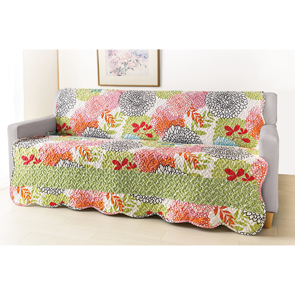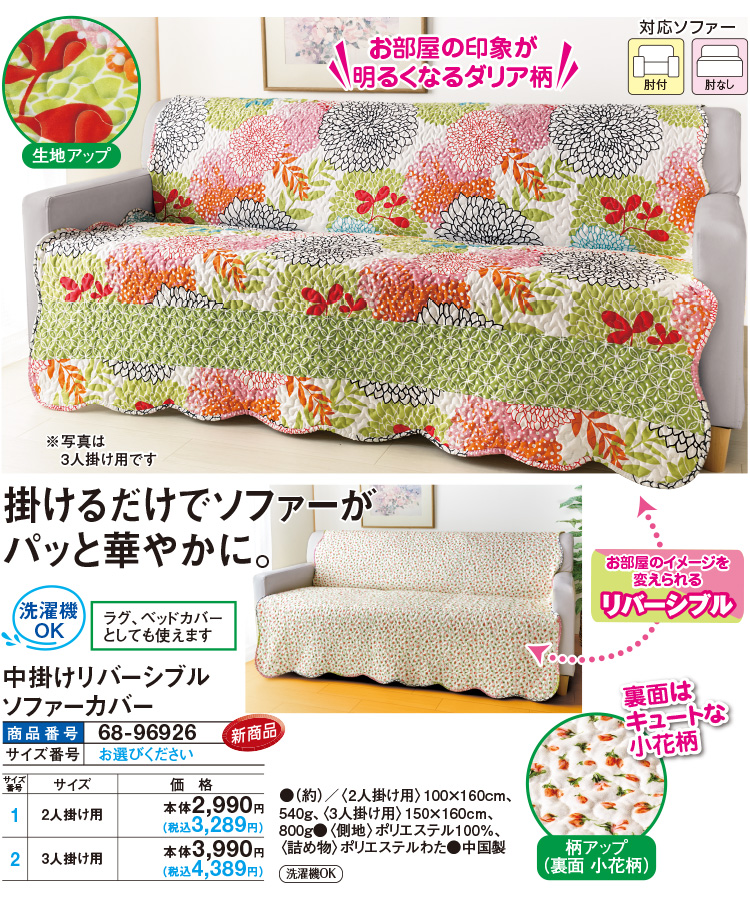 掛けるだけでソファーがパッと華やかに! 【お部屋のイメージを変えられるリバーシブル】 ●お部屋の印象が明るくなるダリア柄 ●裏面はキュートな小花柄 ラグ、ベッドカバーとしても使えます。 【対応ソファー】 ●肘付 ●肘なし