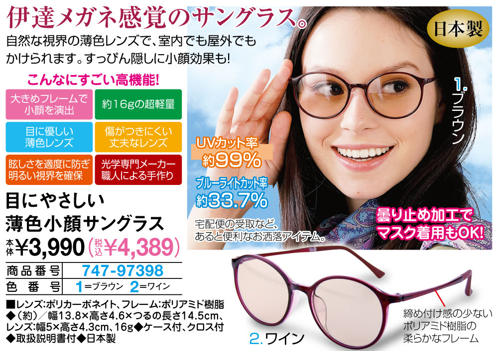 伊達メガネ感覚のサングラス! 自然な視界の薄色レンズで、室内でも屋外でもかけられます。すっぴん隠しに小顔効果も! こんなにすごい高機能! ●大きめフレームで小顔を演出 ●約16gの超軽量 ●目に優しい薄色レンズ ●傷がつきにくい丈夫なレンズ ●まぶしさを適度に防ぎ明るい視界を確保 ●光学専門メーカー職人による手作り ●UVカット率約99% ●ブルーライトカット率約33.7% 曇り止め加工でマスク着用もOK! 宅配便の受取など、あると便利なお洒落アイテム。 締め付け感の少ないポリアミド樹脂の柔らかなフレーム