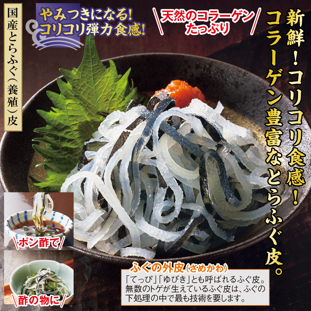 ●セット内容/500g×2袋 ●賞味期限/製造日から冷凍1年 ●加工地/日本 ●原材料/とらふぐの皮(標準和名トラフグ)(国産) ●特定原材料等/なし