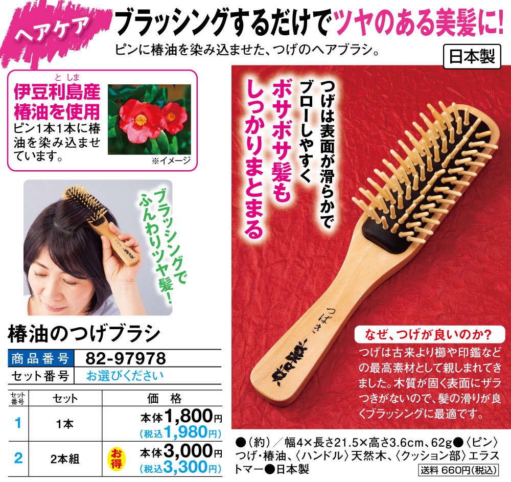 ブラッシングするだけでツヤのある美髪に! ピンと歯に椿油を染み込ませた、つげのヘアブラシ・くし。 ブラッシングでふんわりツヤ髪! つげは表面が滑らかでブローしやすくボサボサ髪もしっかりまとまる 【伊豆利島産椿油を使用】 ピン1本1本に椿油を染み込ませています