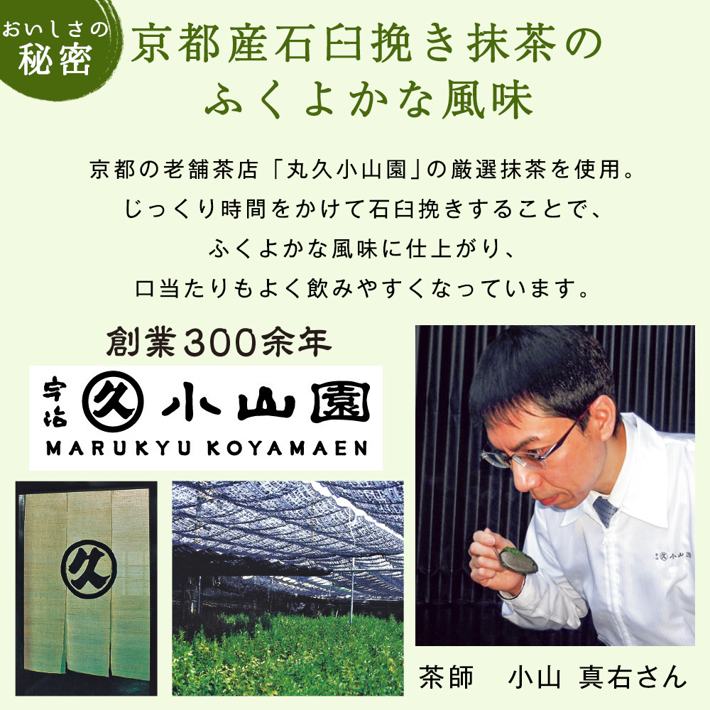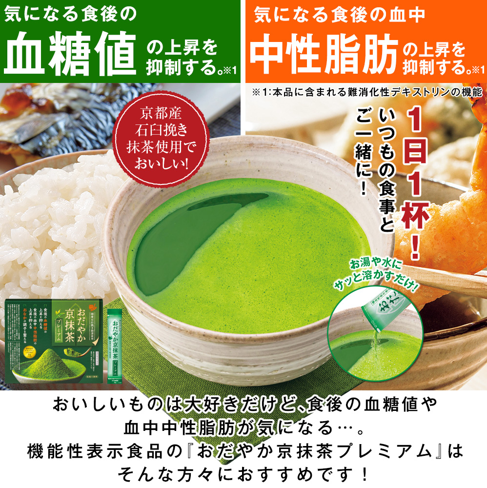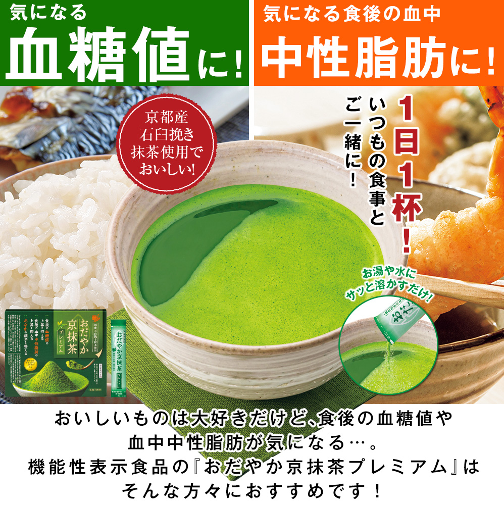 京都産石臼挽き抹茶のふくよかな風味 京都の老舗茶店「丸久小山園」の厳選抹茶を使用。 じっくり時間をかけて石臼挽きすることで、ふくよかな風味に仕上がり、口当たりもよく飲みやすくなっています。 【こんな方に】 ■運動不足を感じている ■食生活に不安がある ■食事の糖、脂肪が気になる ■食後の血糖値、中性脂肪の値が気になり始めた ■お通じを改善したい、お腹の調子が気になる ■食事の量は以前と変わらないのに、健康面で気になる点が出てきた