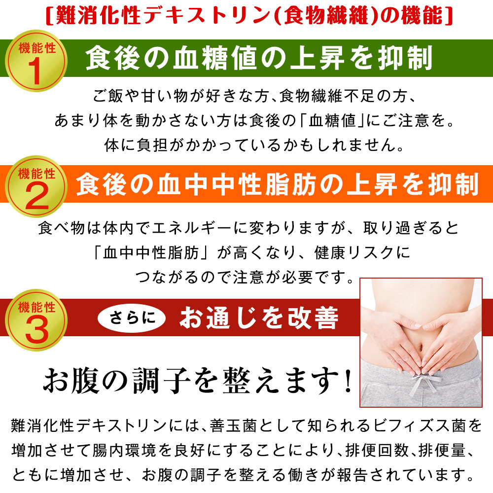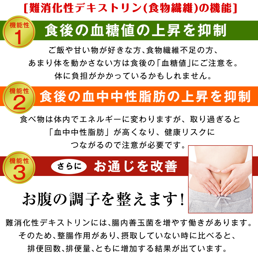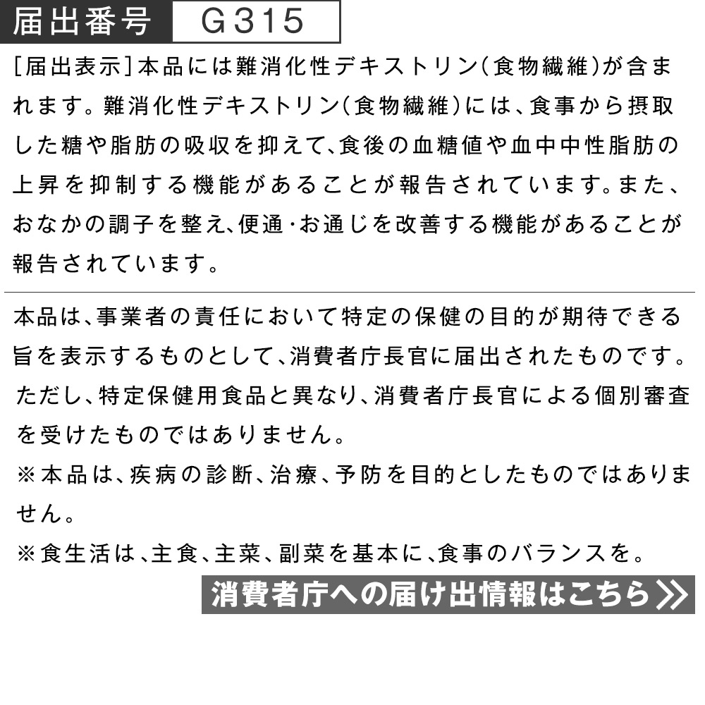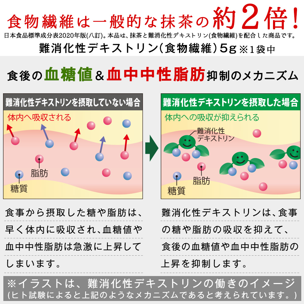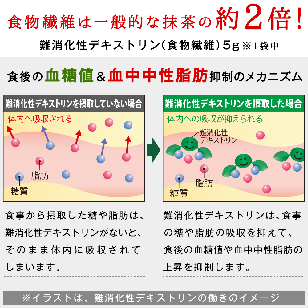 ●内容量/1箱:204g(6.8g×30袋)<顆粒タイプ> ●一日摂取目安量/1袋 ●原材料名/難消化性デキストリン(韓国製造)、抹茶(京都府)/緑茶抽出物 ●栄養成分表示(1袋6.8gあたり)/エネルギー:14kcal、たんぱく質:0.2g、脂質:0.03g、炭水化物:6.3g(糖質:0.4g、食物繊維:5.9g)、食塩相当量:0.0007g、鉄:0.05mg、カリウム:22mg、ビタミンE:0.2mg、ビタミンK:18μg、葉酸:10μg ●機能性関与成分(1袋6.8gあたり)/難消化性デキストリン(食物繊維):5g ●その他の成分(1袋6.8gあたり)/カフェイン:27mg、カテキン:110mg、β-カロテン:163μg 【保存方法】高温・多湿、直射日光を避け、なるべく涼しい所に保存してください。 【保存上の注意】乳幼児の手の届かない所に保存してください。品質保持のため開封後はチャックをしっかり閉め、なるべくお早めにお召し上がりください。