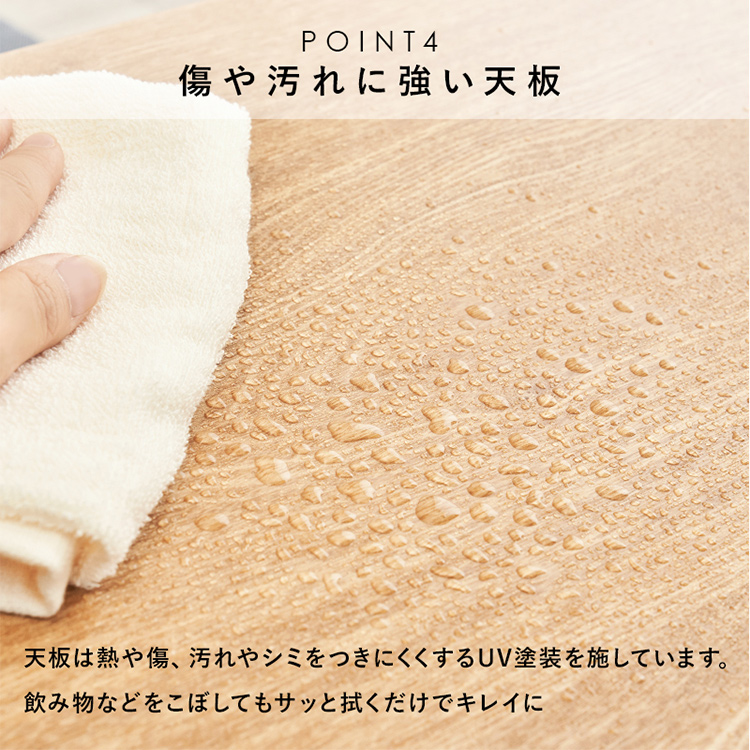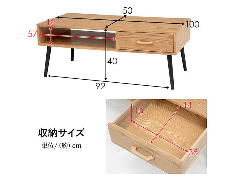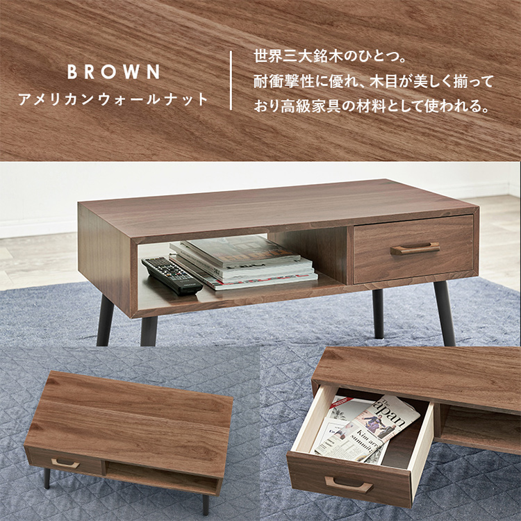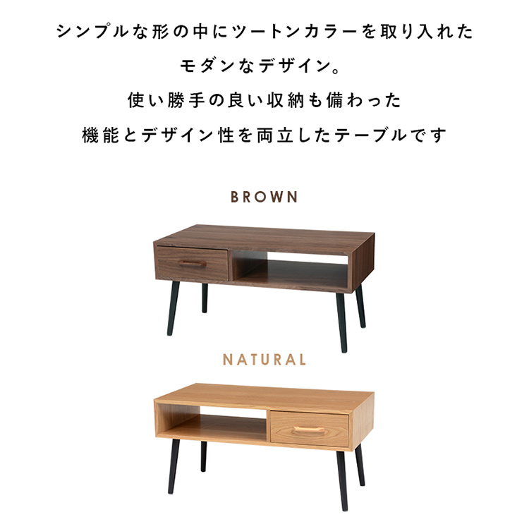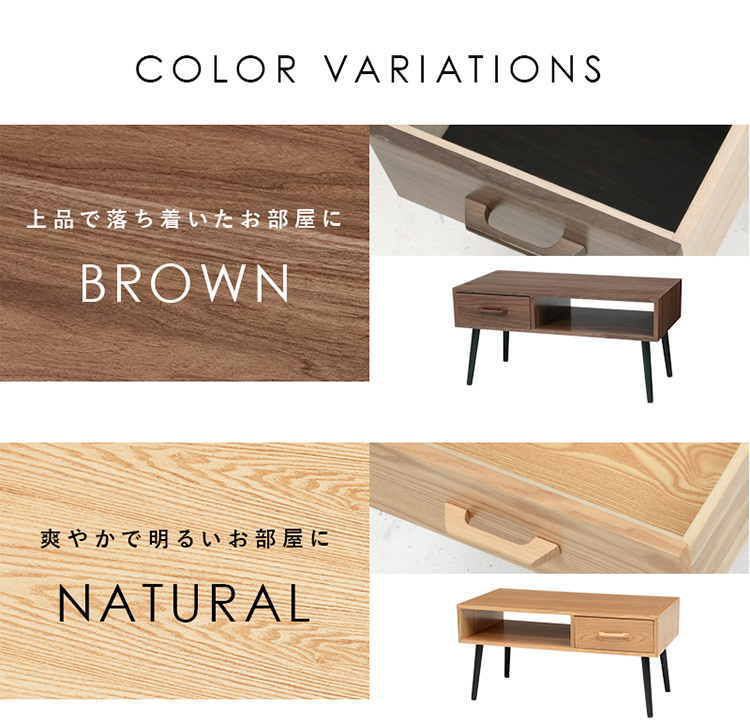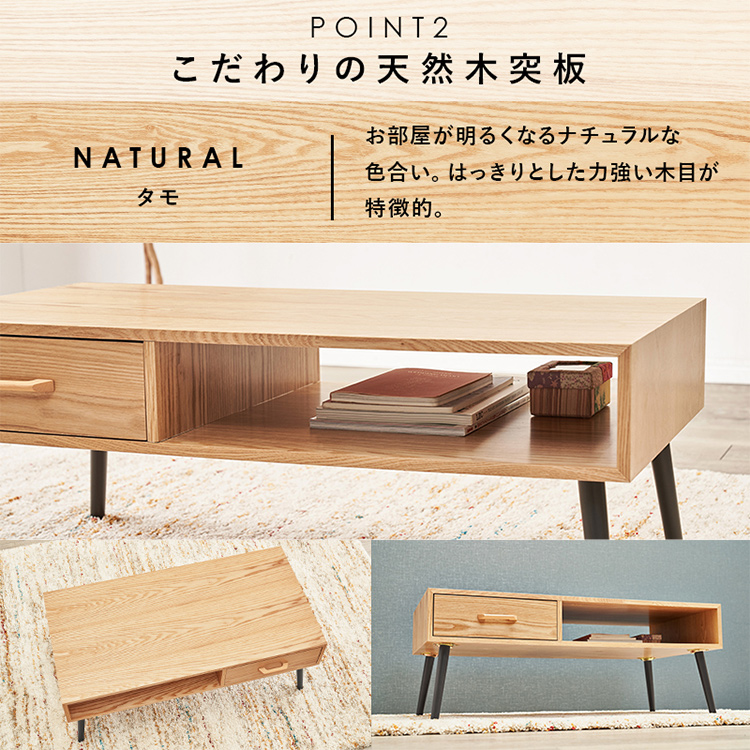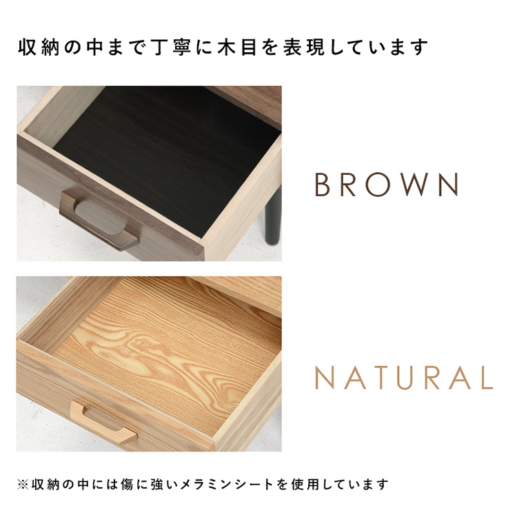 シンプルな形の中にツートンカラーを取り入れたモダンなデザイン。 使い勝手の良い収納も備わった機能とデザイン性を両立したテーブルです。 ■こだわりの天然木突板 (ナチュラル)タモ:お部屋が明るくなるナチュラルな色合い。はっきりとした力強い木目が特徴的。 (ブラウン)アメリカンウォールナット:世界三大銘木の一つ。耐衝撃性に優れ、木目が美しく揃っており高級家具の材料として使われる。 ■両面から引き出せる収納 引出しは両面から引き出せるのでどんなレイアウトにも合わせやすい。引出しにはテレビのリモコンや雑誌はもちろんA4サイズのものをすっぽり収納。 ■収納の中まで丁寧に木目を表現しております。 ※収納の中には傷に強いメラミンシートを使用しております。 ■傷や汚れに強い天板 天板は熱や傷、汚れやシミをつきにくくするUV塗装を施しております。 飲み物などをこぼしてもサッと拭くだけでキレイに。